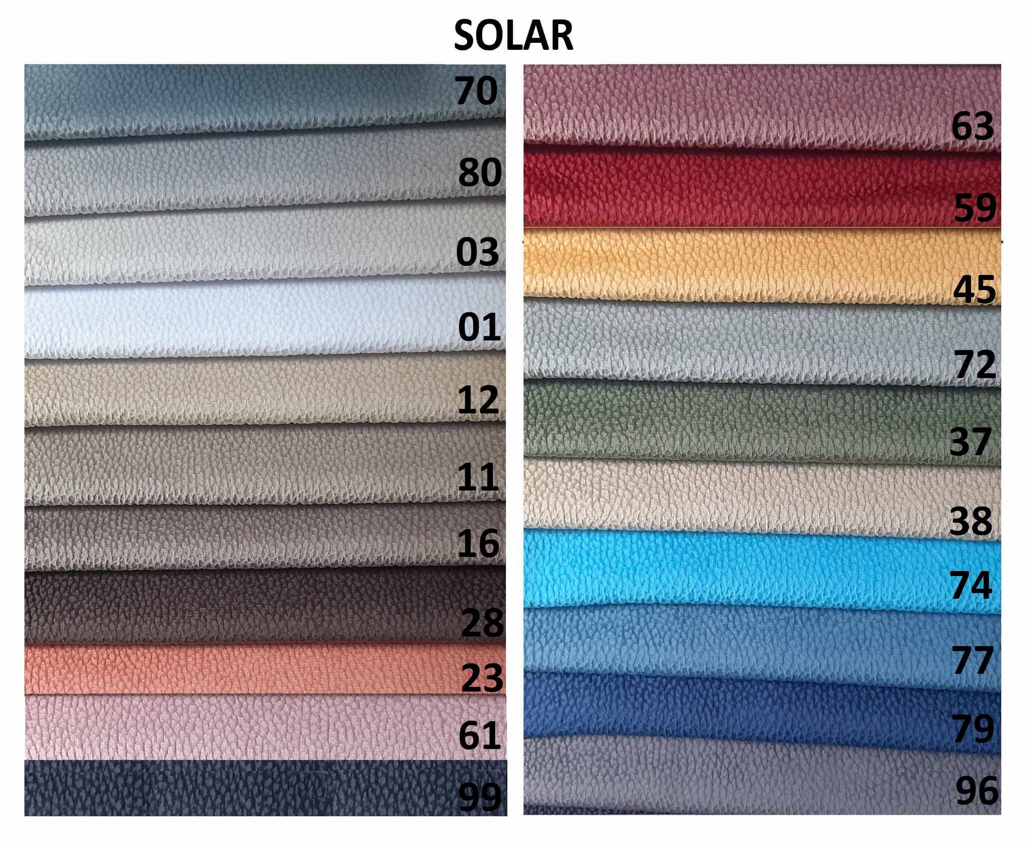 SOLAR - tkanina miękka i mięsista - miła i przyjemna w dotyku. Zwana "Pet Frendly" - przyjazna zwierzętom jak i również łatwa w czyszczeniu. Posiada dużą i ciekawą paletę kolorów.
