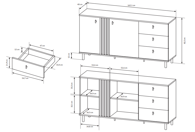 - Komoda posiada otwierane drzwi oraz 3 szuflady.