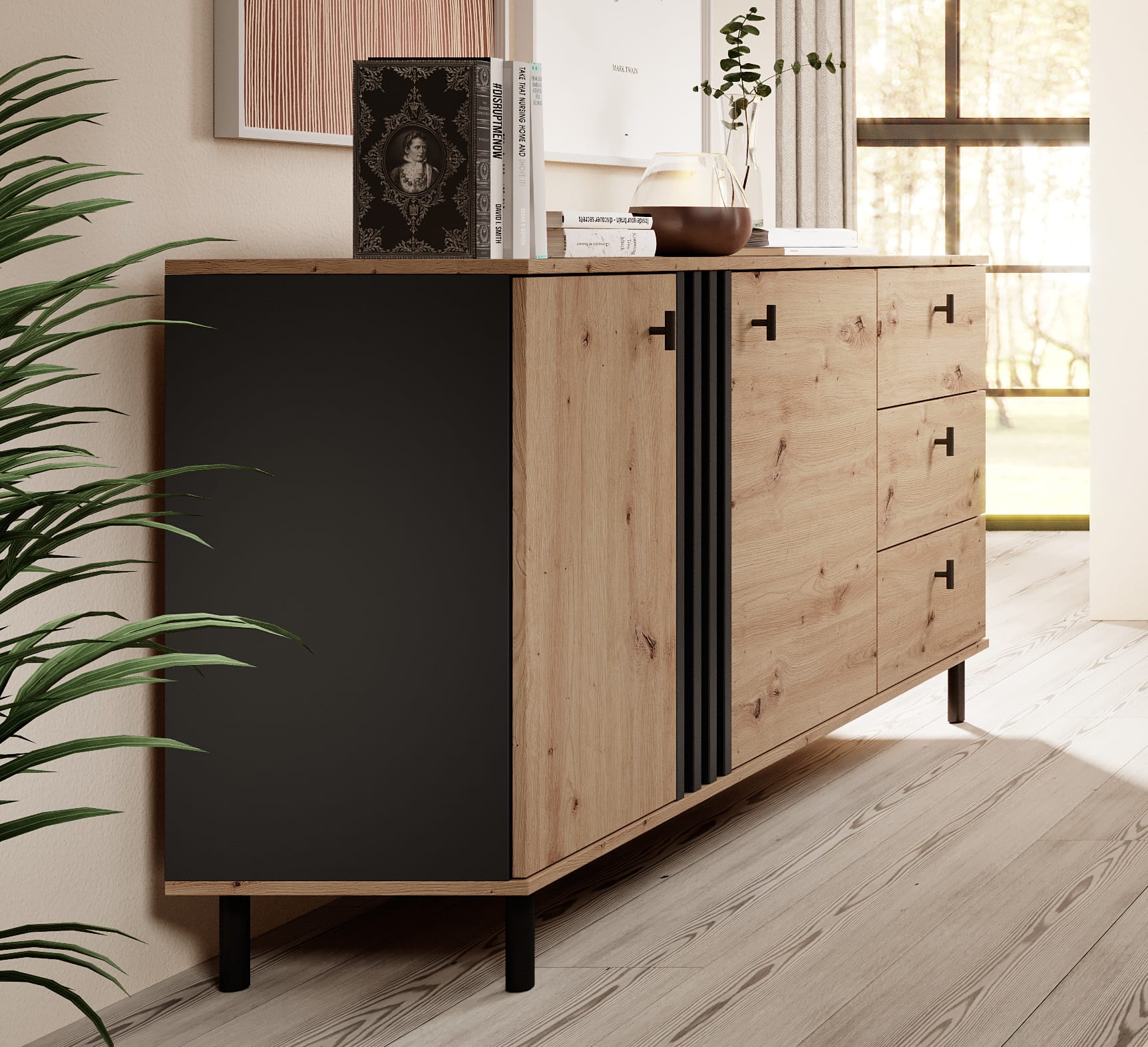 - Bryły systemu MADIS wykonane są w płycie laminowanej 16 mm, w kolorystyce dąb artisan + czarny antracyt.