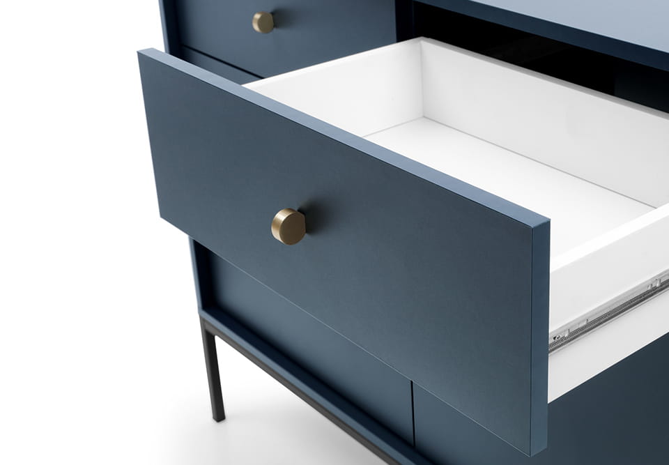 - Komoda posiada korpus i front oklejony obrzeżem ABS.