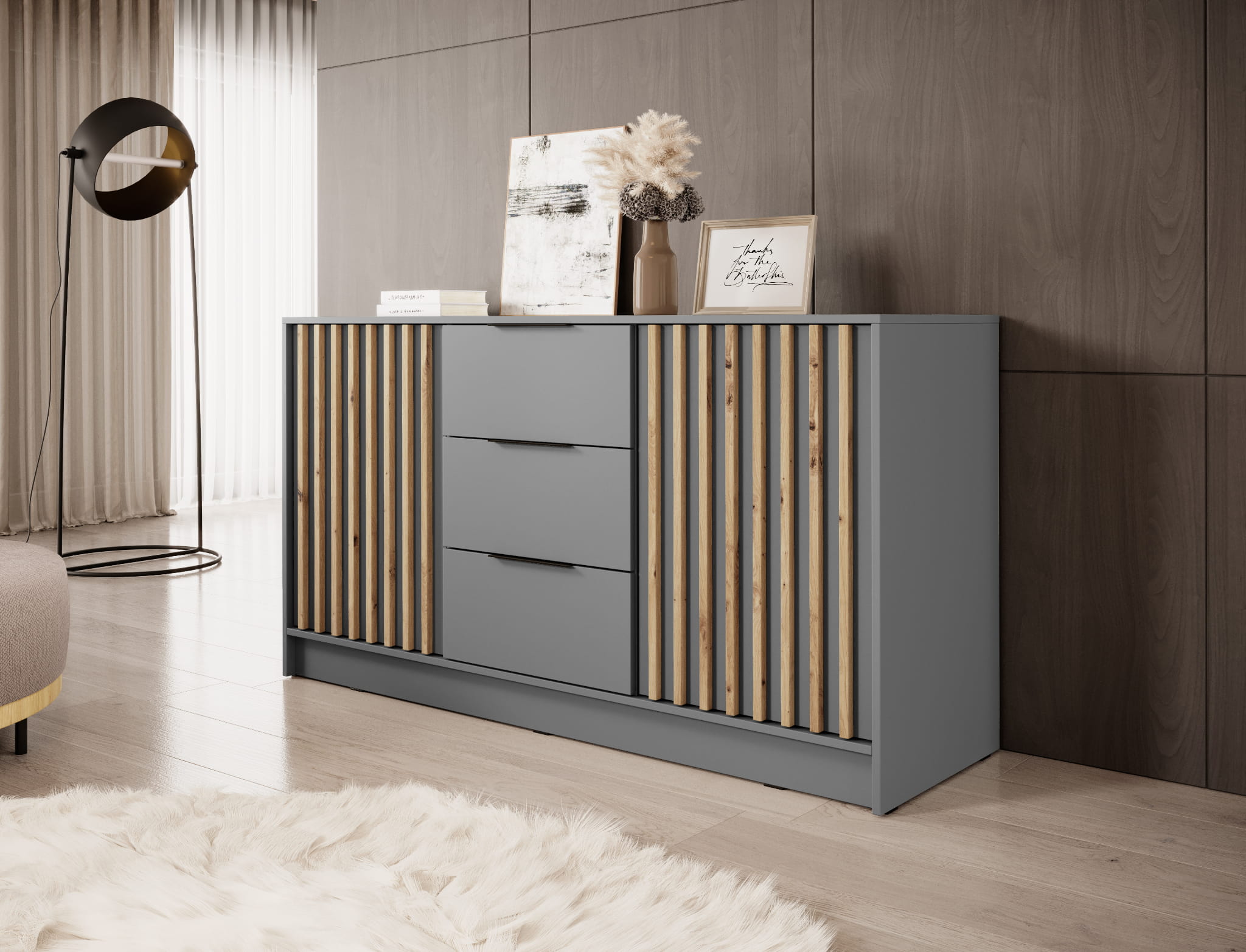 - Komoda idealnie sprawdzi się w salonie o nowoczesnym wnętrzu. Zastosowane lamele z pewnością przykują uwagę.