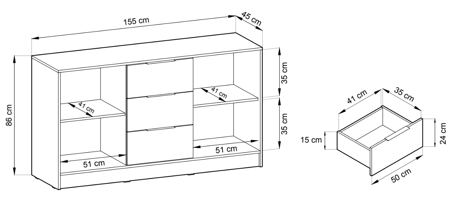 - Posiada 3 pojemne szuflady oraz szafkę.