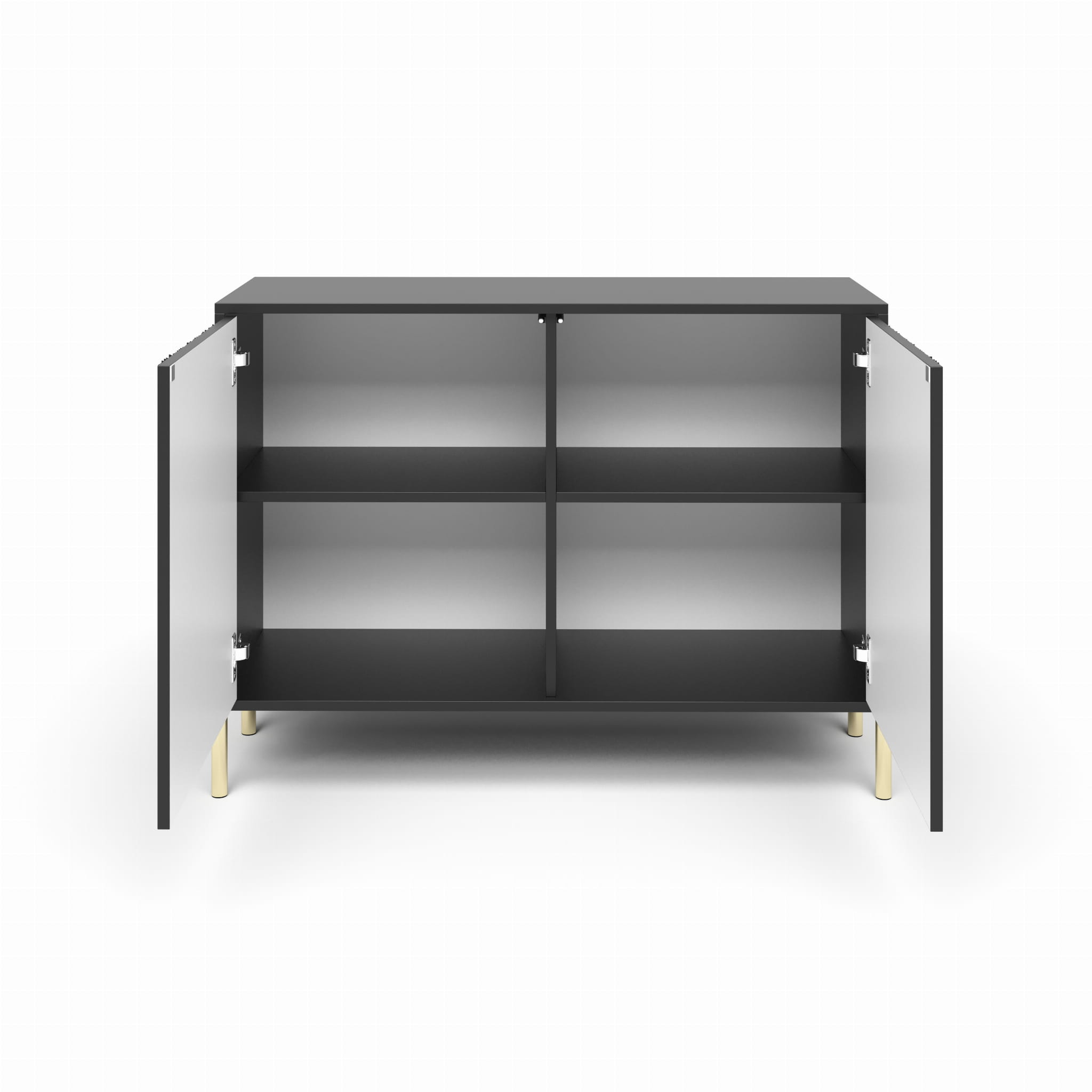 - Komoda posiada 2 otwierane fronty z półkami wewnątrz.
