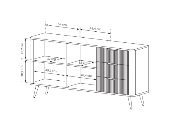 Delikatnie zaokrąglone krawędzie łagodzą linię brył, sprawiając, że całość prezentuje się lekko i harmonijnie. Smukłe, walcowate nóżki dodają konstrukcji lekkości, a jednocześnie wnoszą do wnętrza odrobinę luksusu. Metalowe, minimalistyczne uchwyty podkreślają nowoczesny styl, stanowiąc subtelne, ale efektowne dopełnienie całości.