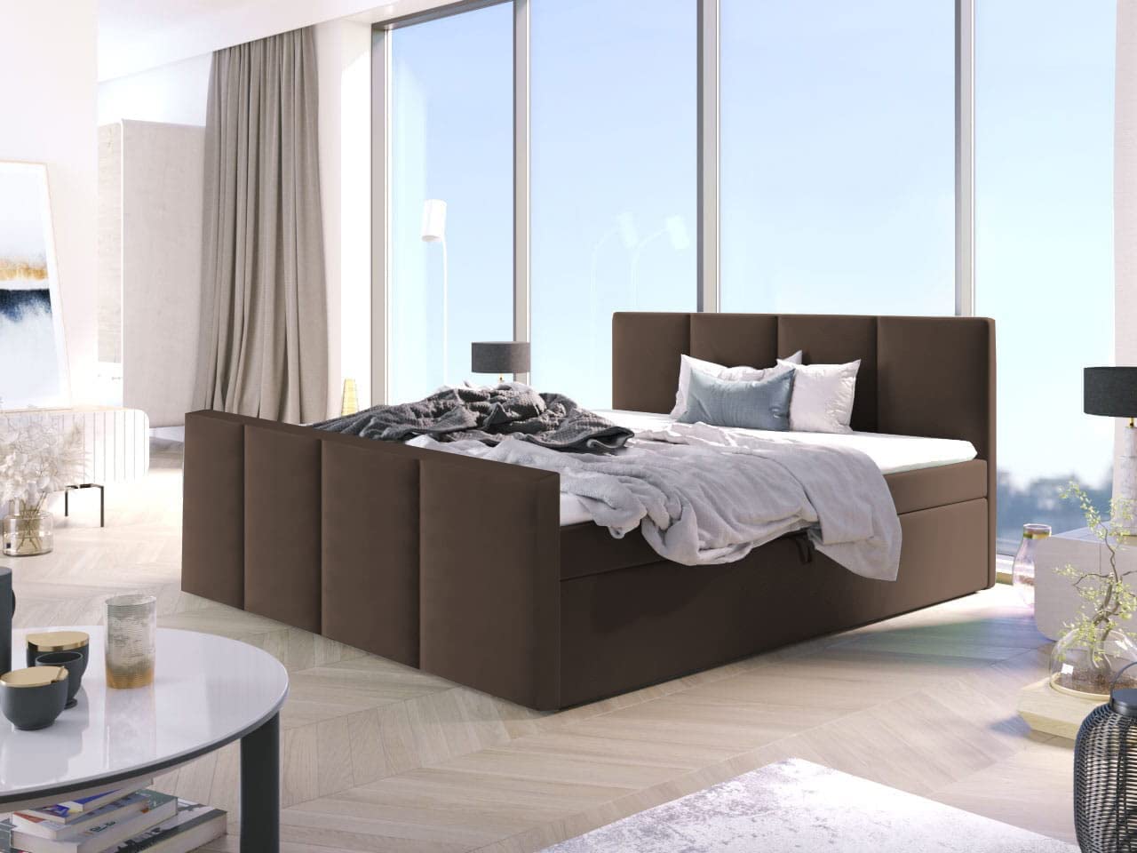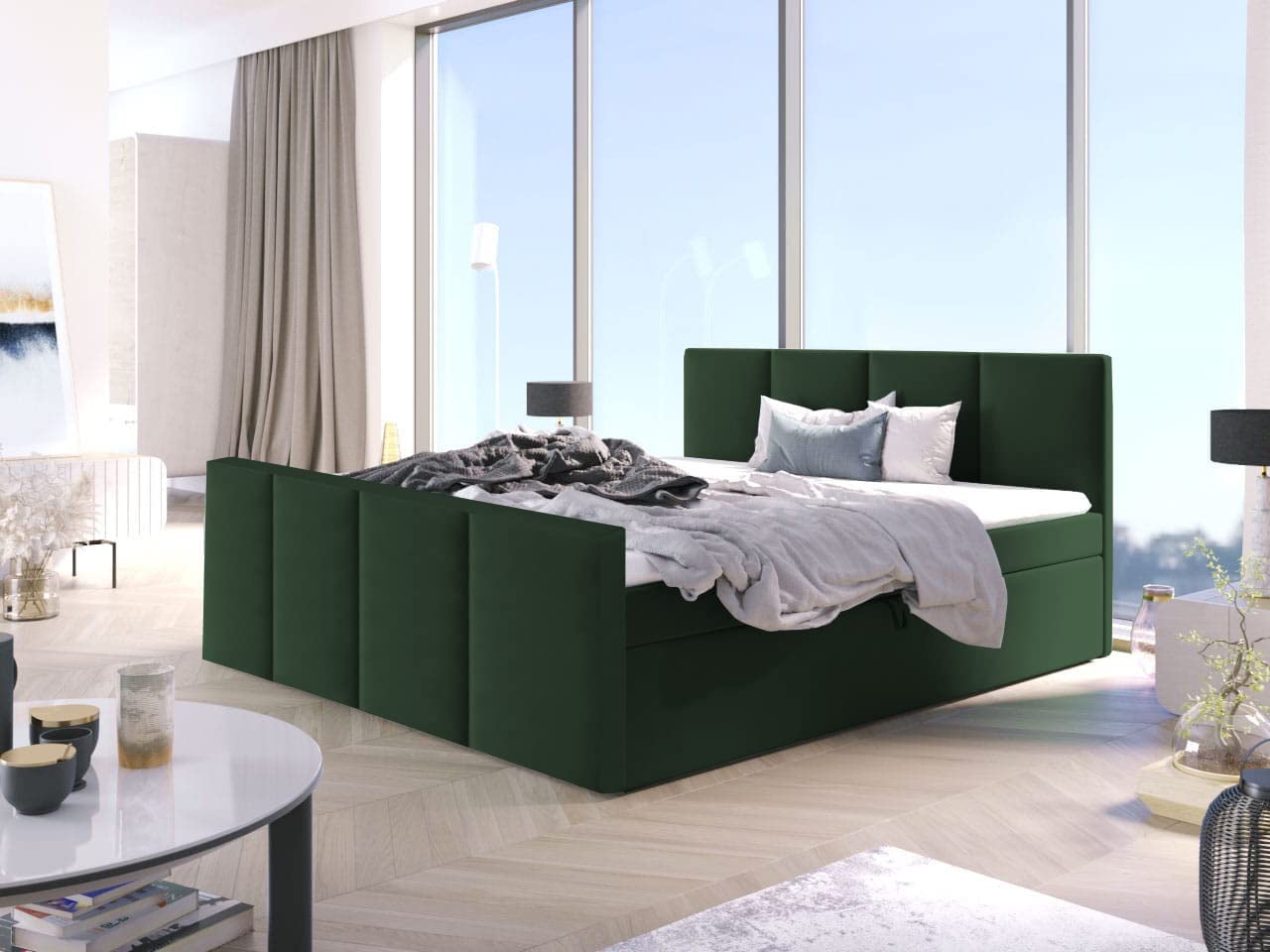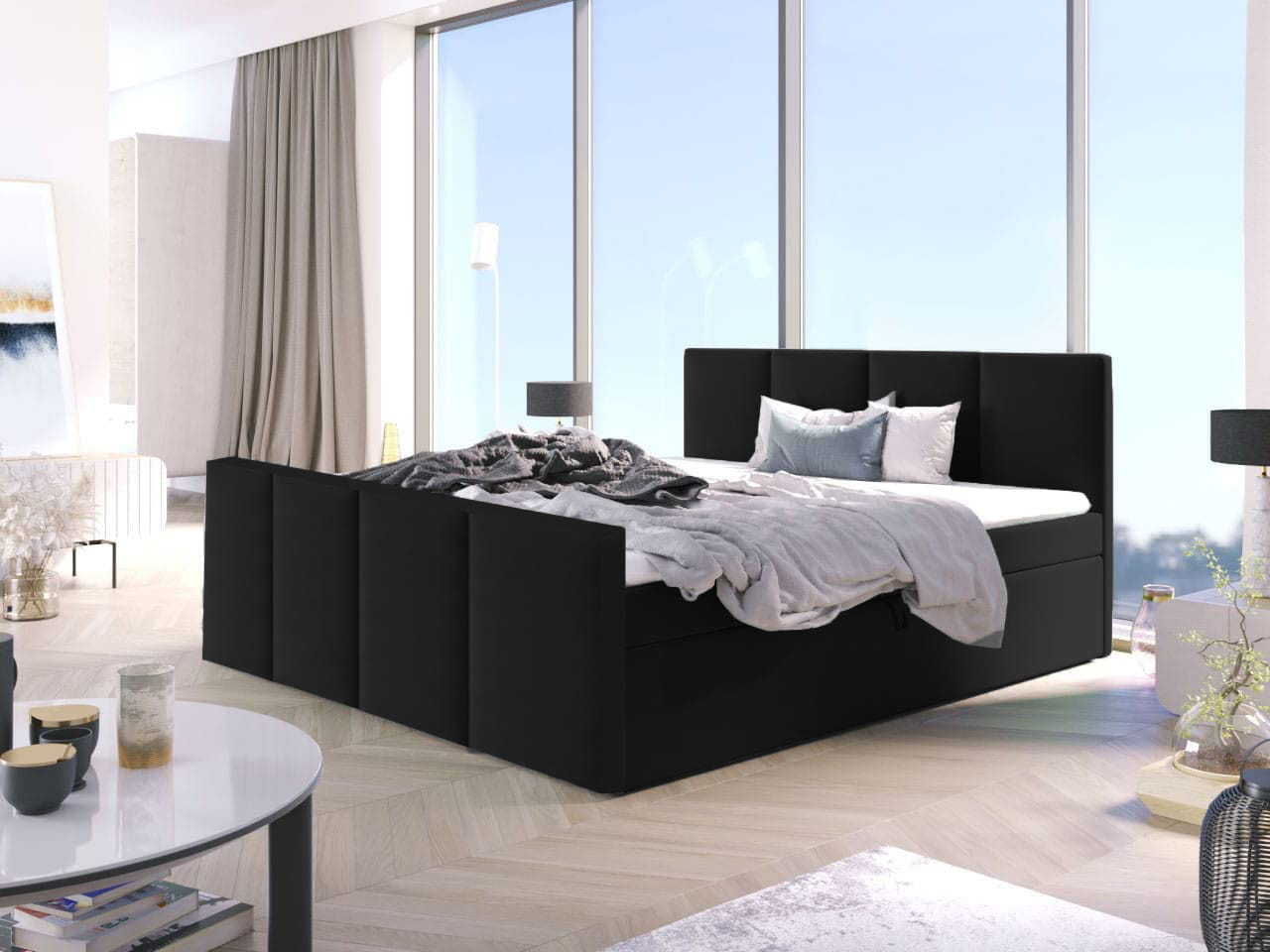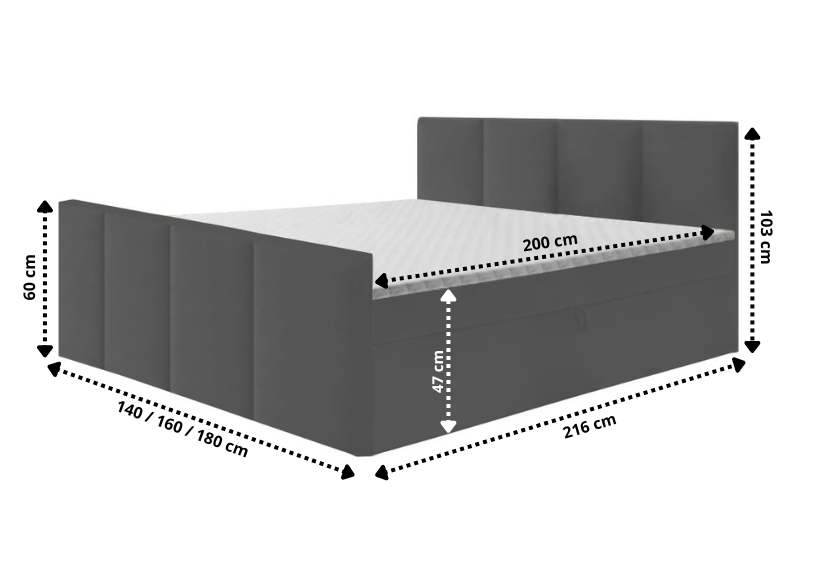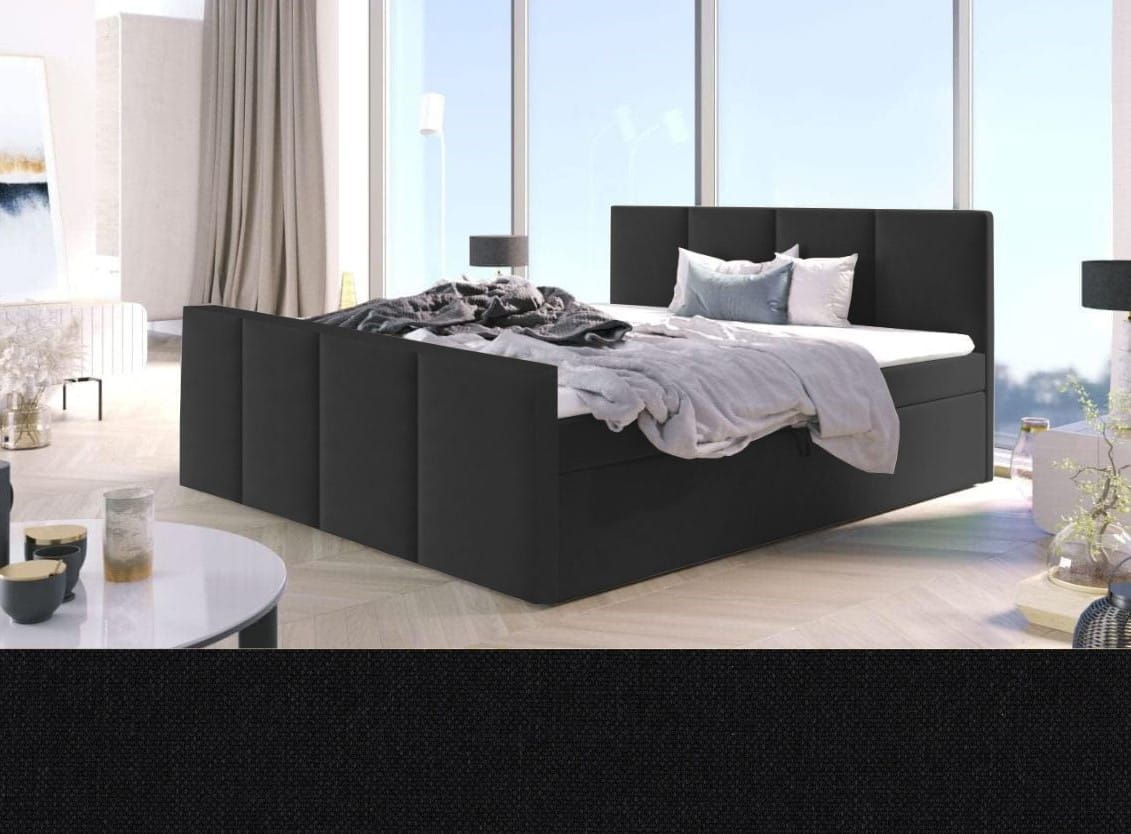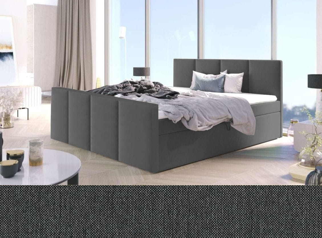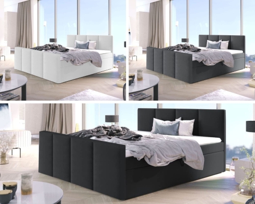 - Boxspring ARIS to praktyczne łóżko wykonane z wysokiej jakości materiałów, które posiada dwa pojemniki na pościel.