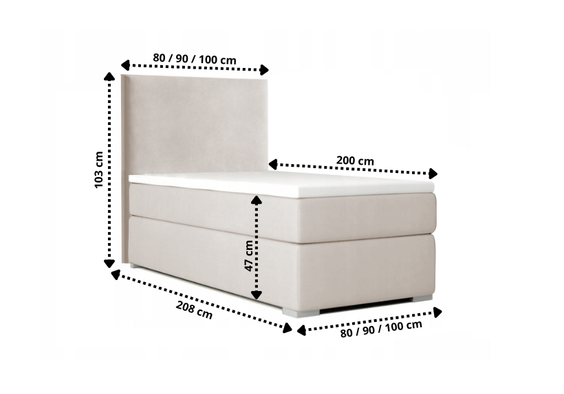 Łóżko składa się z materaca wykonanego ze sprężyny typu bonell + pianki wysoko elastycznej T30, pojemnika na pościel otwieranego od przodu łóżka oraz automatu na sprężynach ułatwiający otwieranie pojemnika.