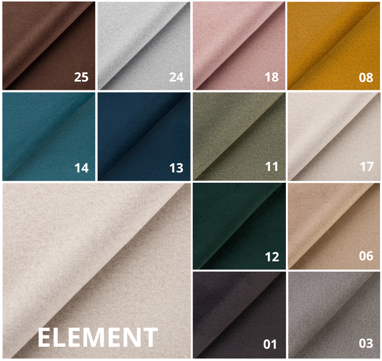 DOSTĘPNE TKANINY: ELEMENT - tkania miła i przyjemna w dotyku. Wykonana w Technologii WATER BLOCKED, która zapewnia ograniczoną wchłanialność rozlanych płynów. Tkanina przyjazna zwierzętom, dzieciom oraz środowisku.