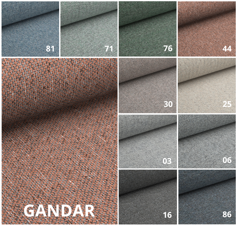 GANDAR - ciekawa pleciona tkanina melanżowa. Wytrzymała i mocna, Plecionka w różnych odcieniach nici, które sprawiają, że tkanina jest niepowtarzalna. Dostępna jest w szerokiej gamie kolorystycznej.