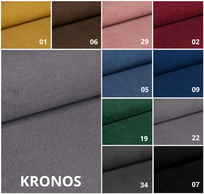 KRONOS - miękka i przyjemna w dotyku tkanina - plusz. Posiada gęste połyskujące włosie, które mieni się w świetle. Mikrowłoski tkaniny zmieniają również subtelnie swoje położenie, gdy przejedzie się po nich dłonią.