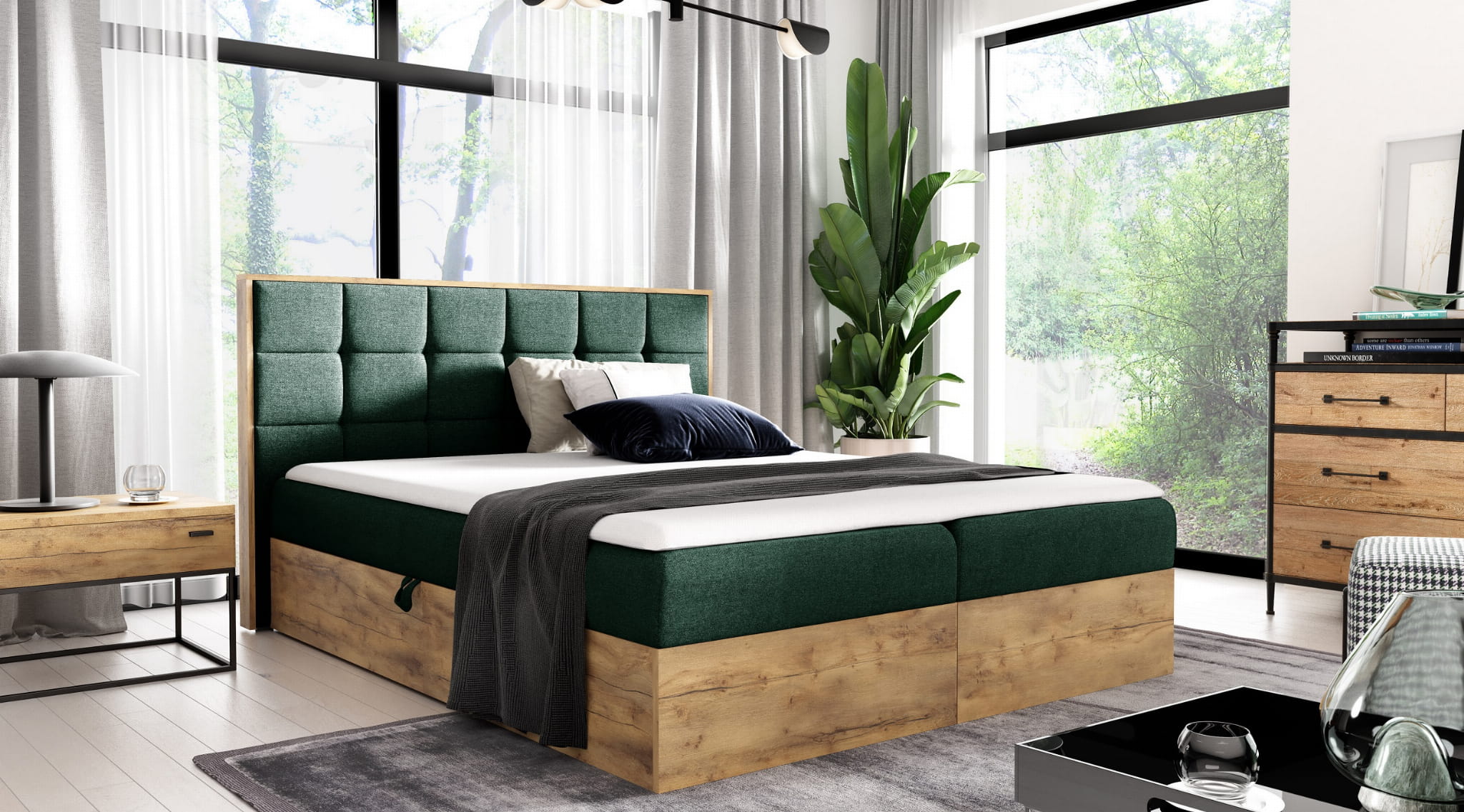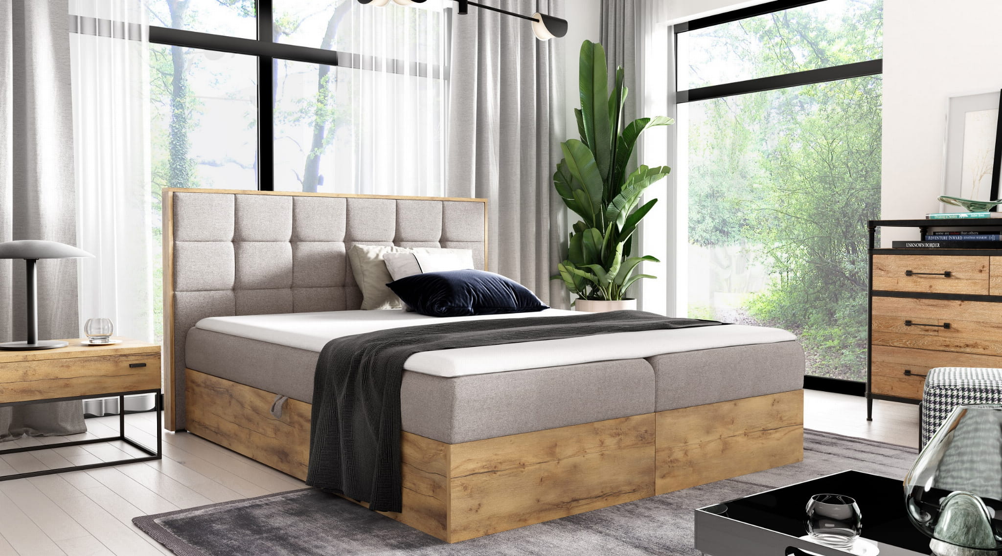 - Boxspring WOODY 1 to eleganckie łóżko ze skrzynią i zagłówkiem wykonanym z drewna.