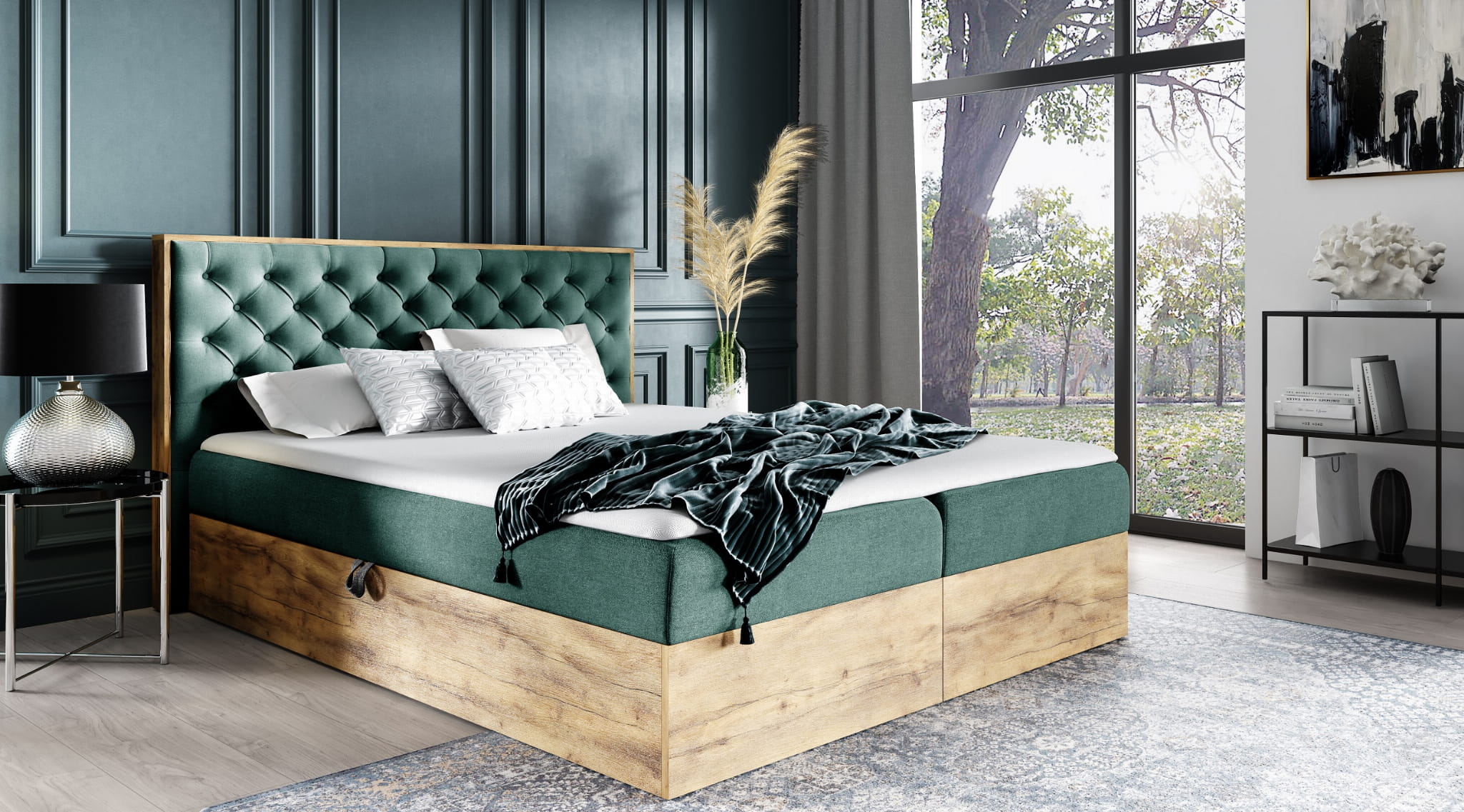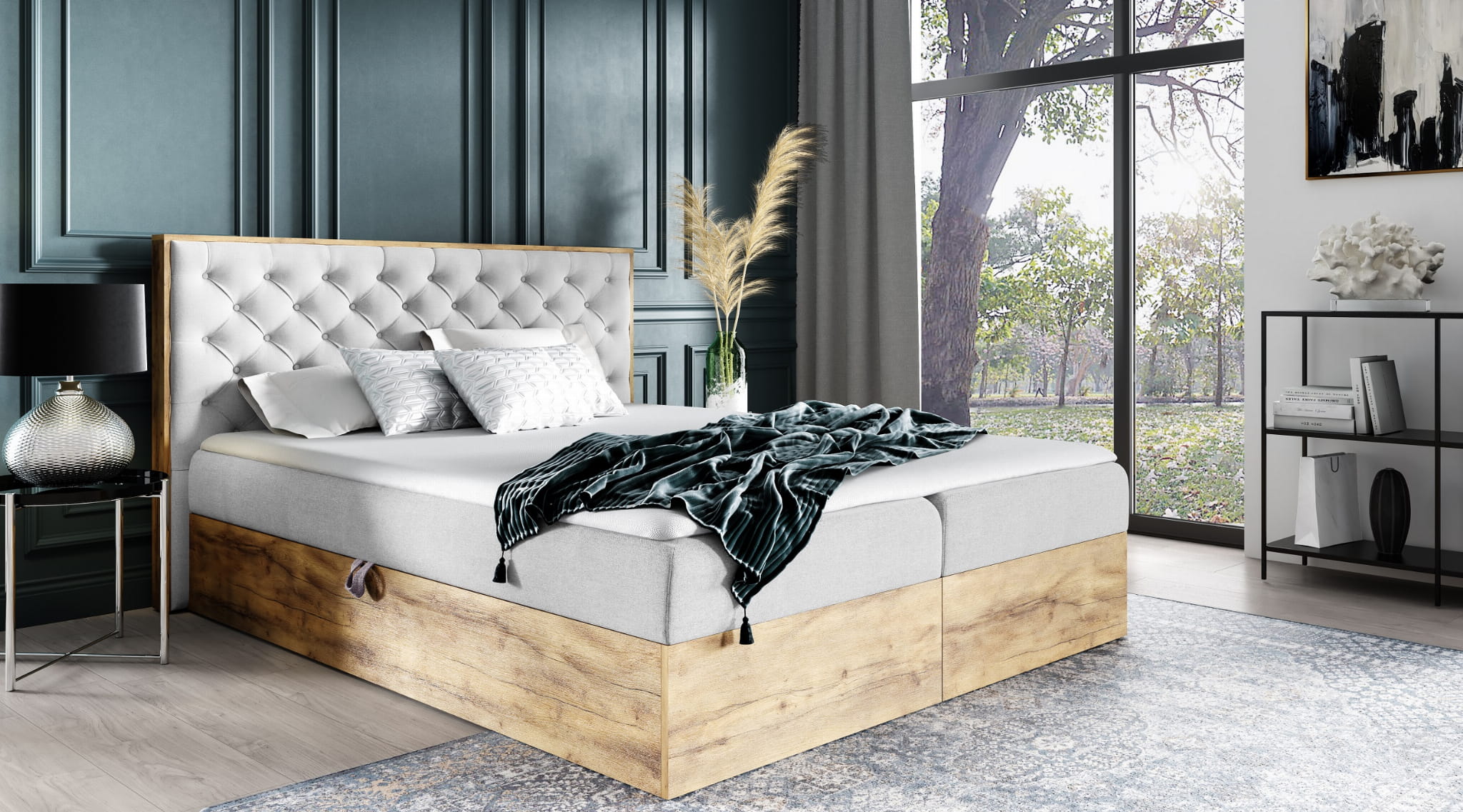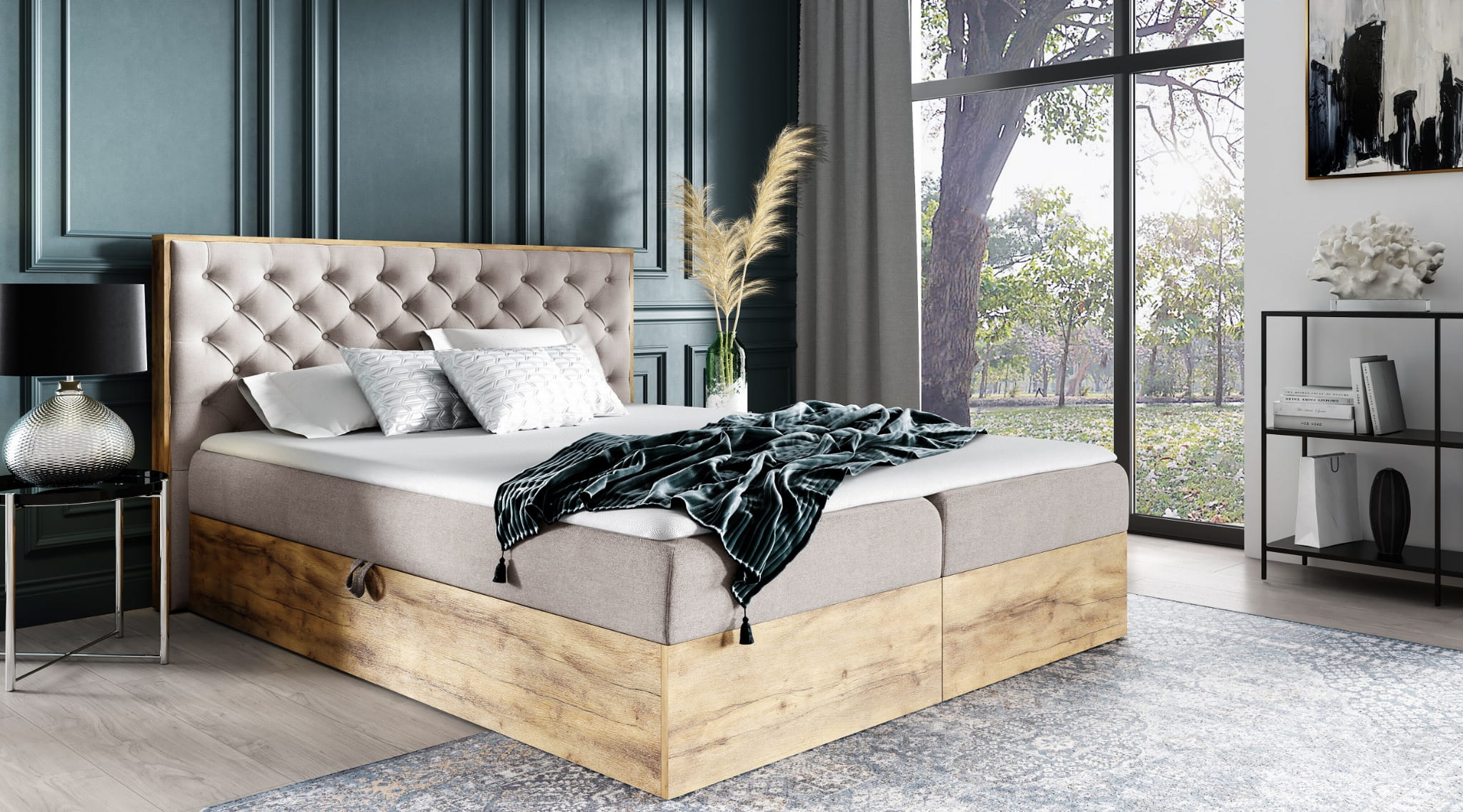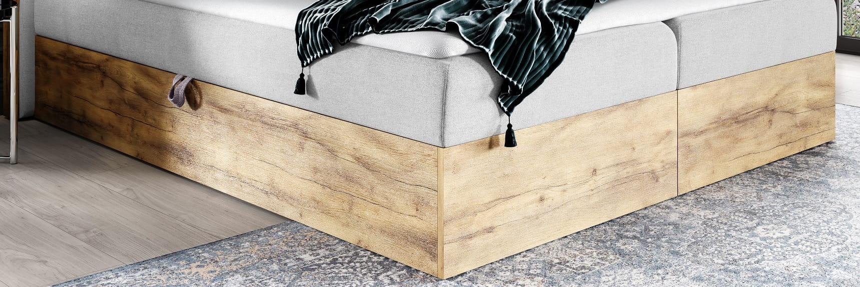 - WOODY 3 to nowoczesne łóżko wykonane na skrzyni z drewna.