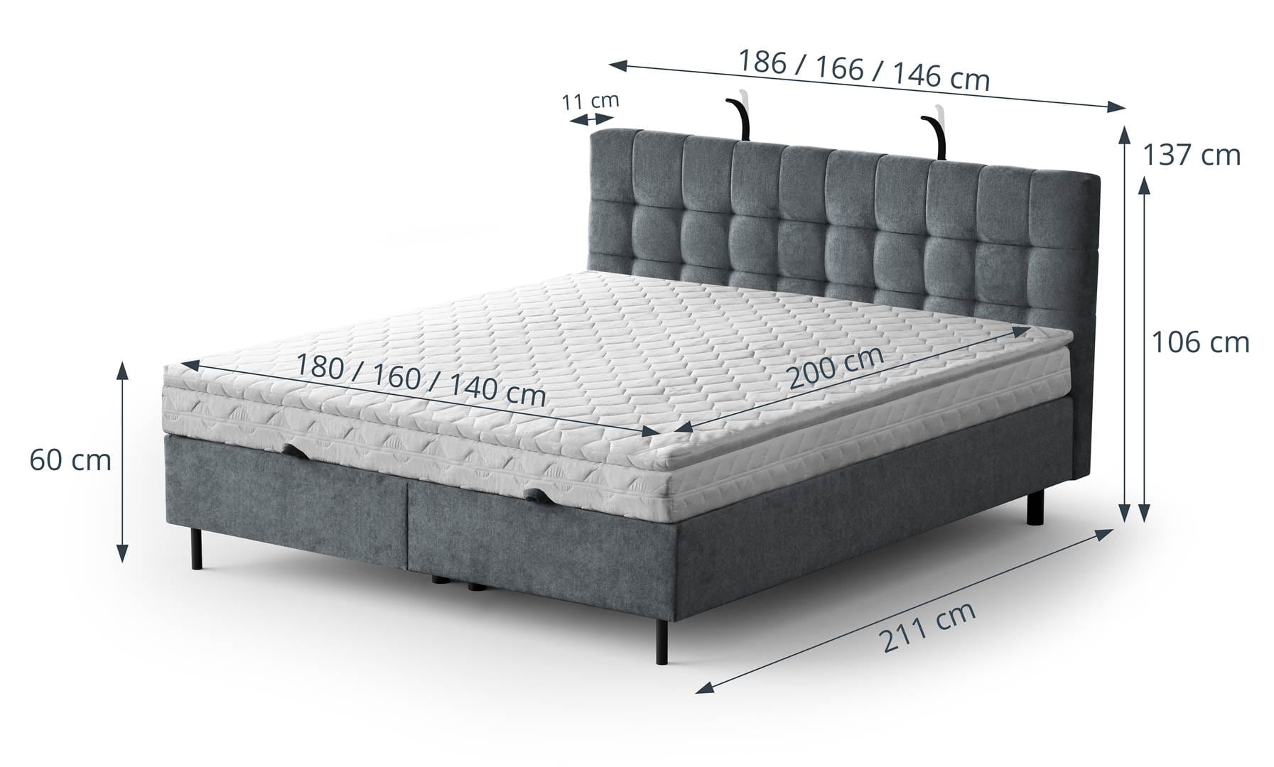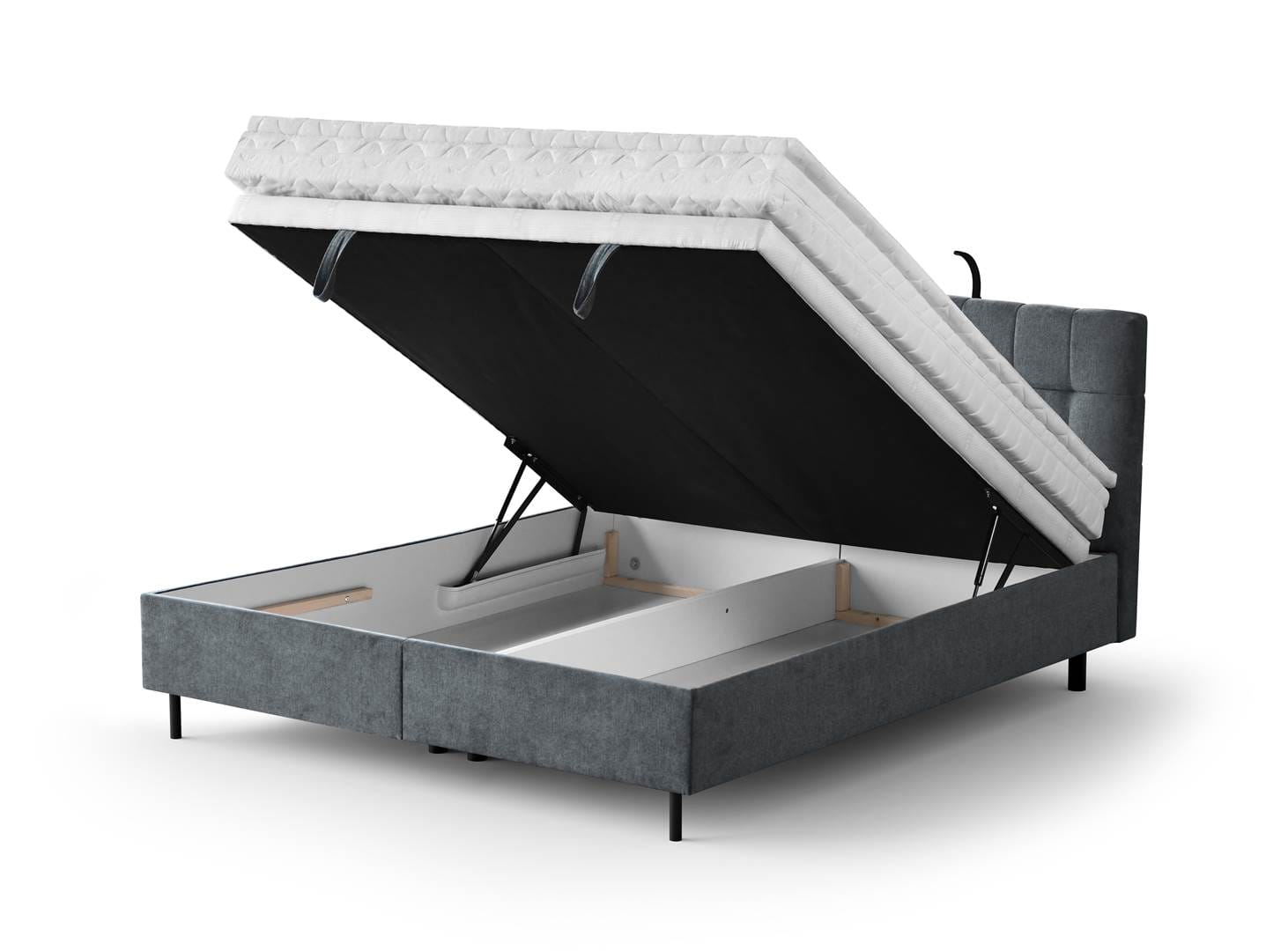 - Posiada pojemnik na pościel otwierany za pomocą podnośników gazowych, które ułatwiają jego podnoszenie.
