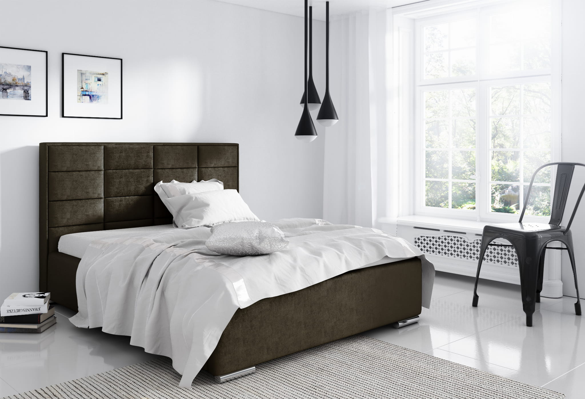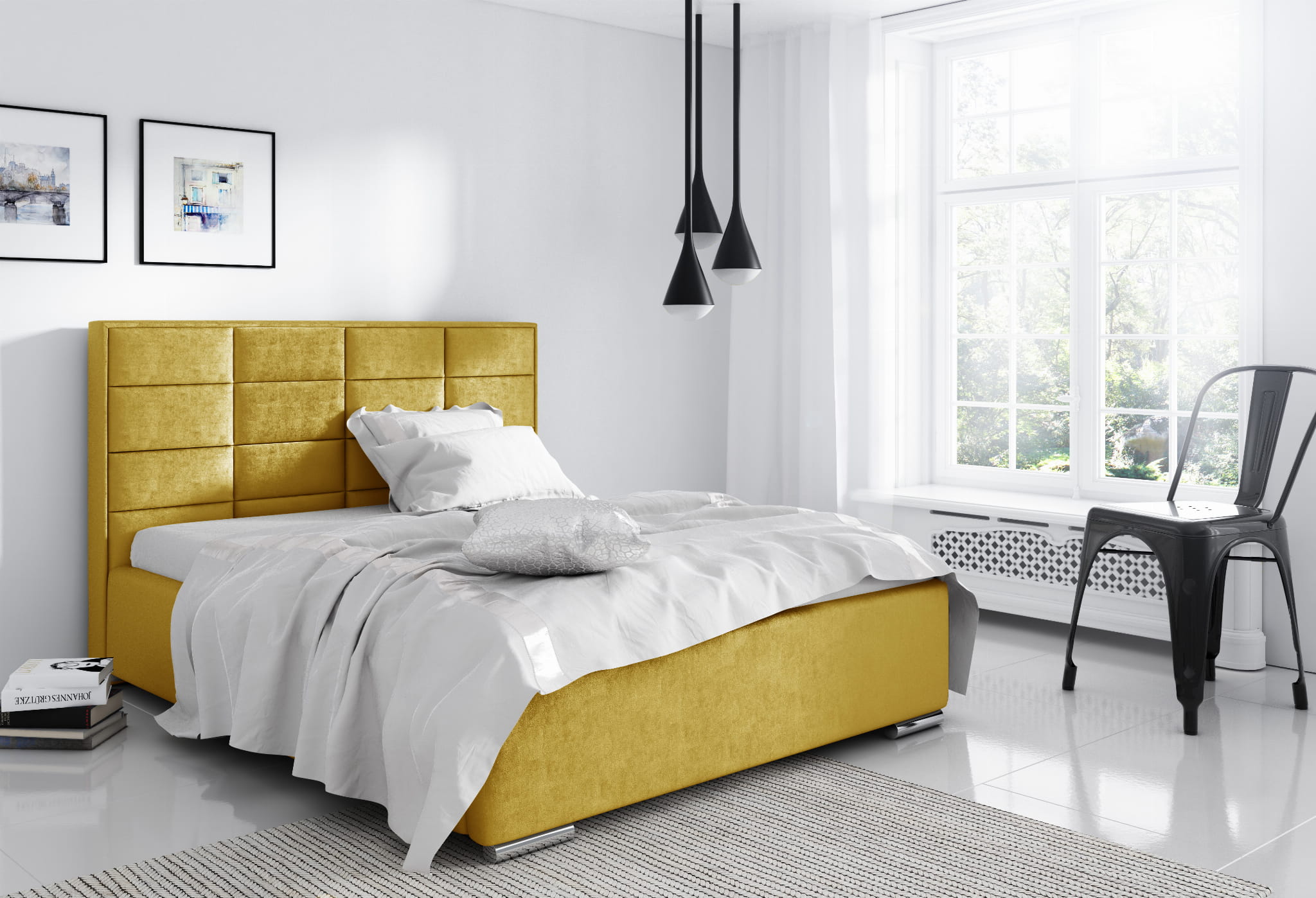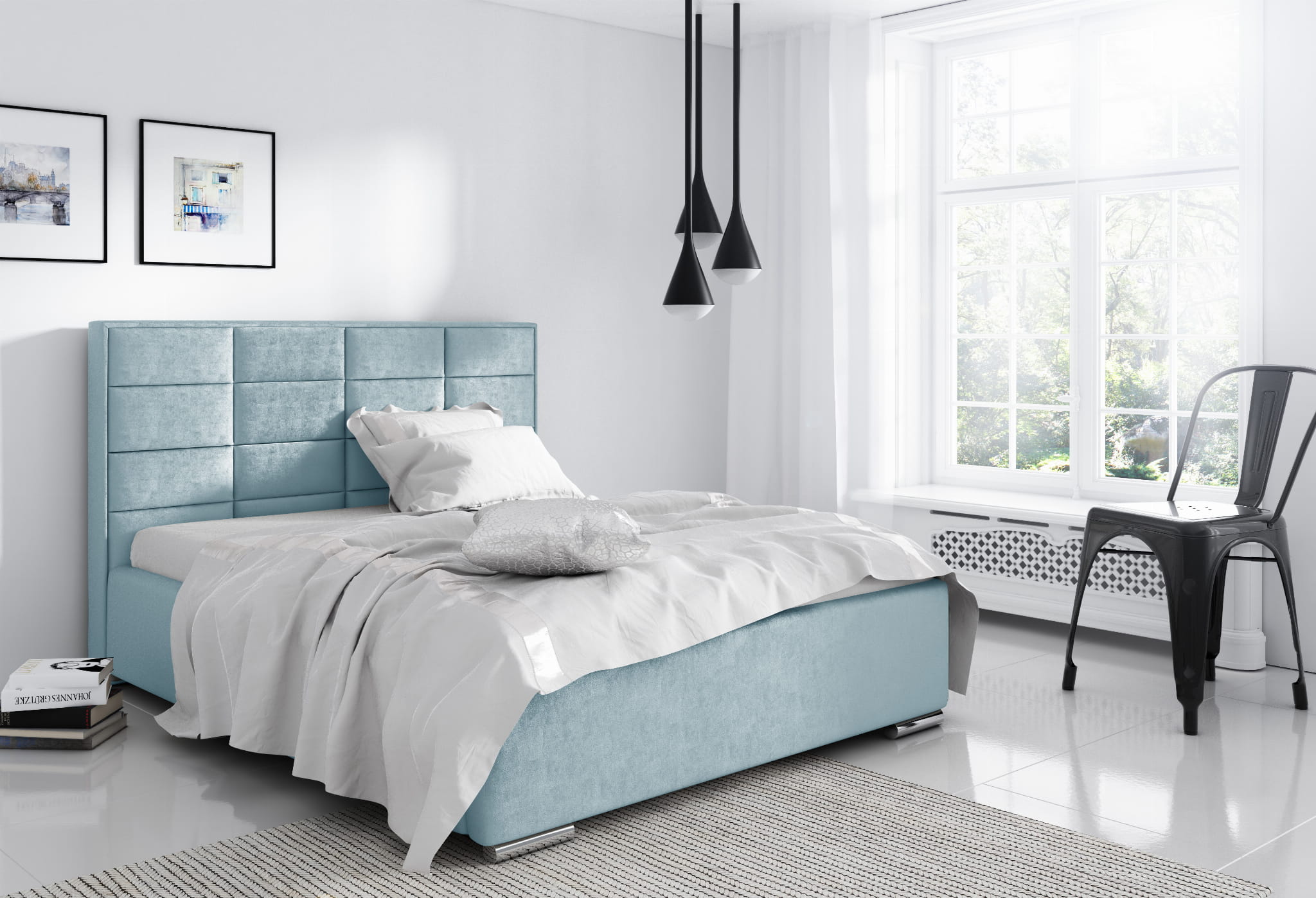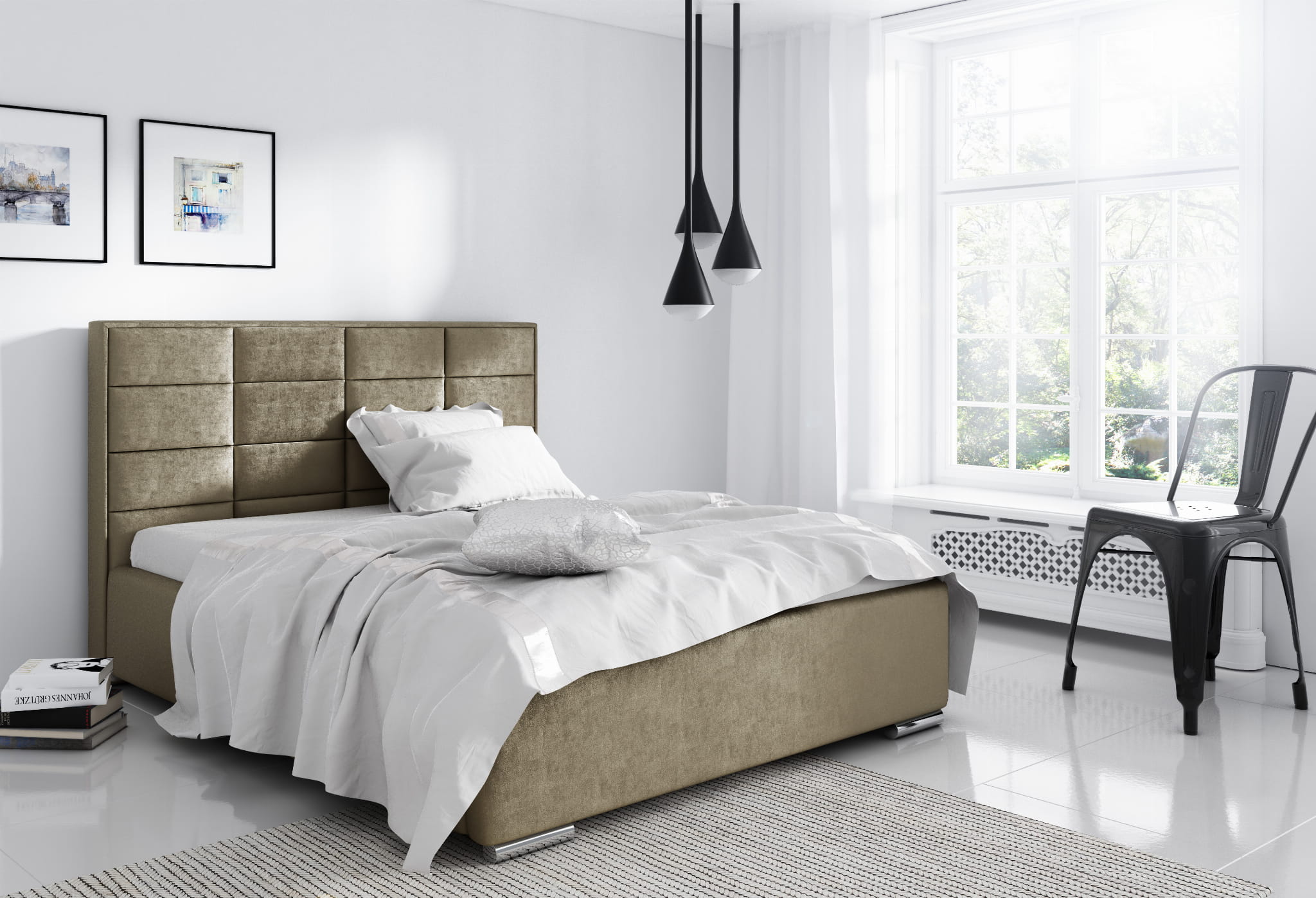 - Wysoki zagłówek wykonany z paneli tapicerowanych, pikowany na piance o grubości 3 cm.