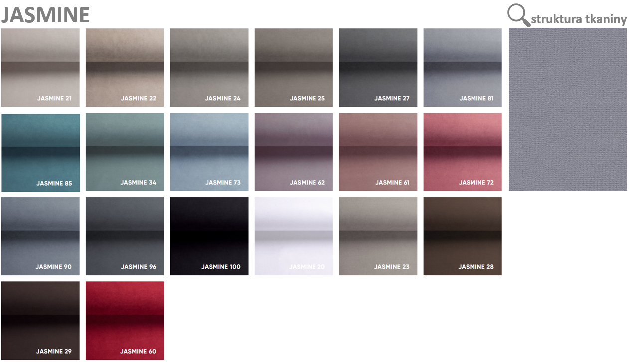 Wzornik z kolorami tkanin jest materiałem poglądowym i nie stanowi podstawy do reklamacji. Ze względu na ograniczenia wynikające z technologii oraz indywidualnych ustawień monitora, kolory mebli oraz tkanin ukazane na ekranie monitora mogą różnić się od rzeczywistych kolorów oferowanych mebli.