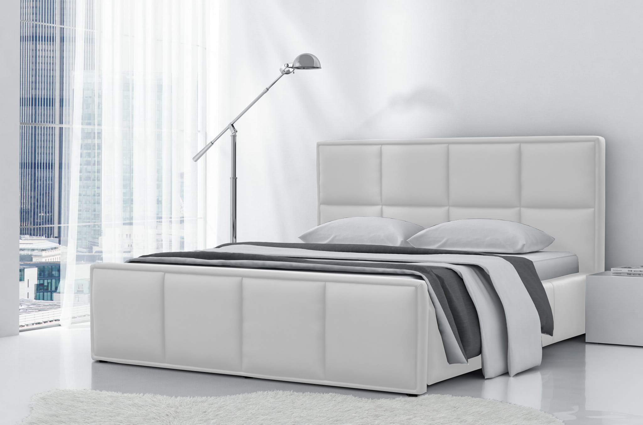 - Łóżko posiada duży pojemnik wykonany z białej płyty laminowanej - 34 listwy sprężynujące, stelaż metalowy, siłowniki gazowe 1000N