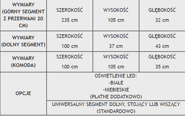 - Meblościanka posiada uniwersalny dolny segment - wiszący lub stojący