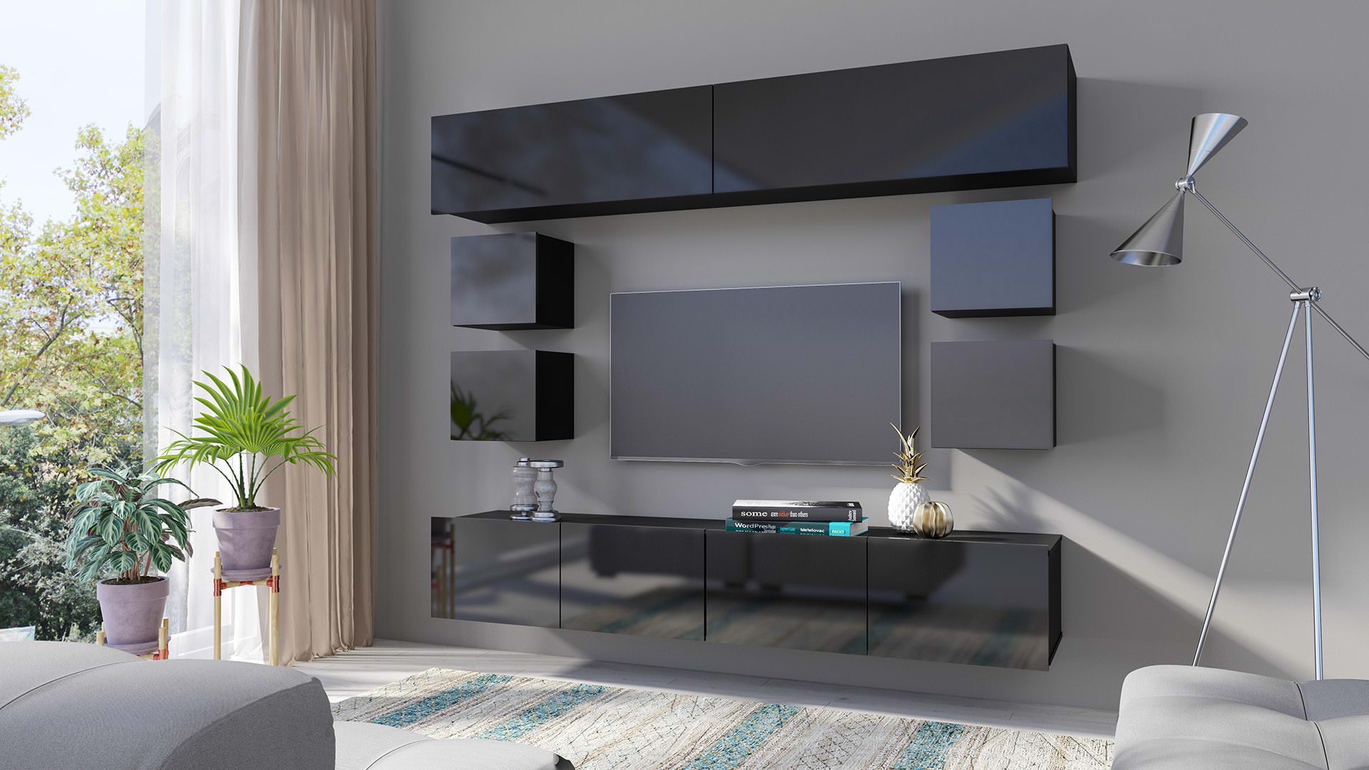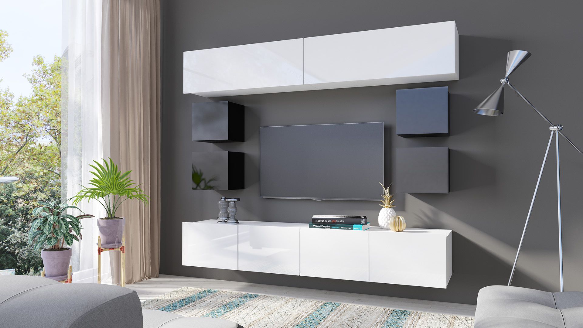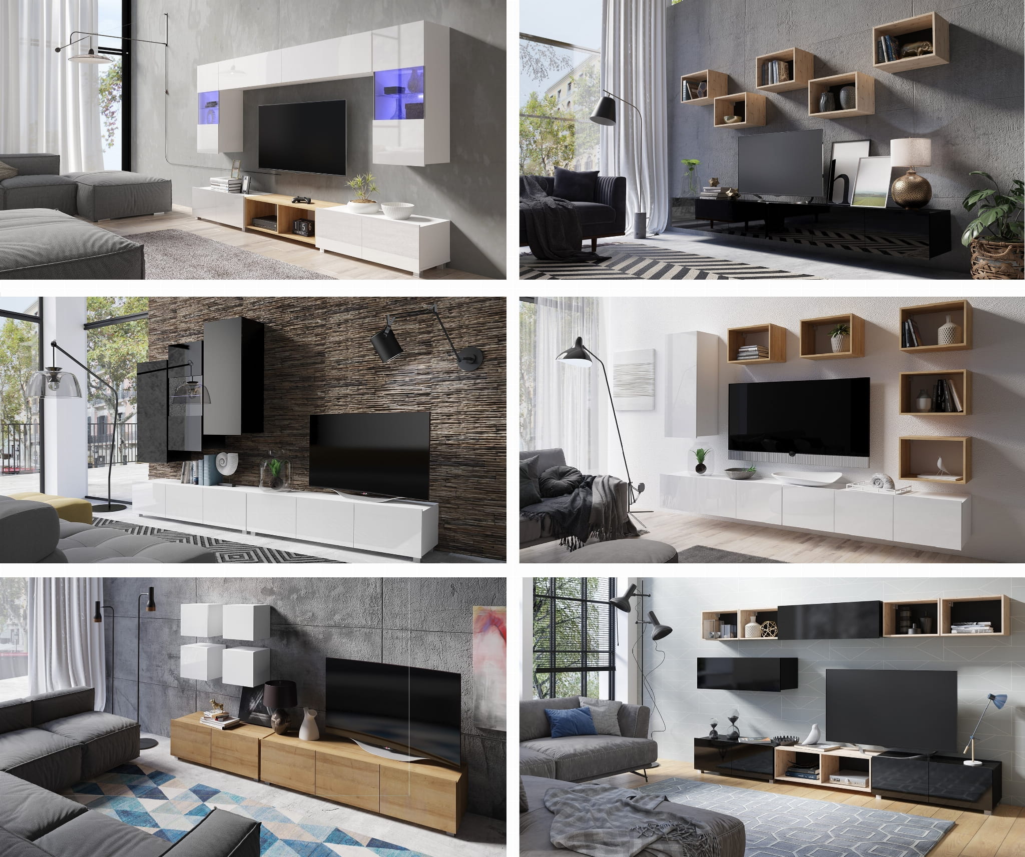 - Zestaw składa się z: 2x półka wisząca pozioma, 4x szafka kwadrat, 2x stolik RTV 100