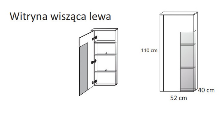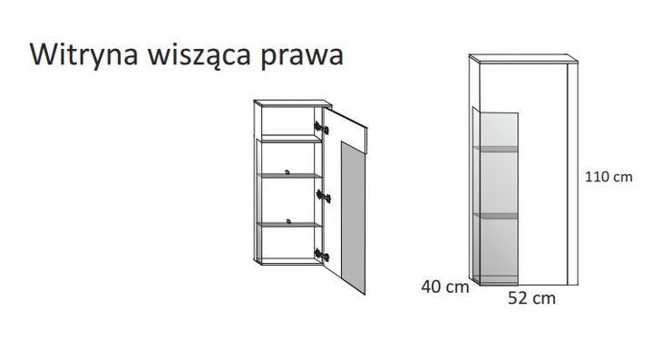 - Meblościanka składa się z: witryna wisząca lewa, witryna wisząca prawa, półka, dołek RTV, stolik prawy oraz stolik lewy.