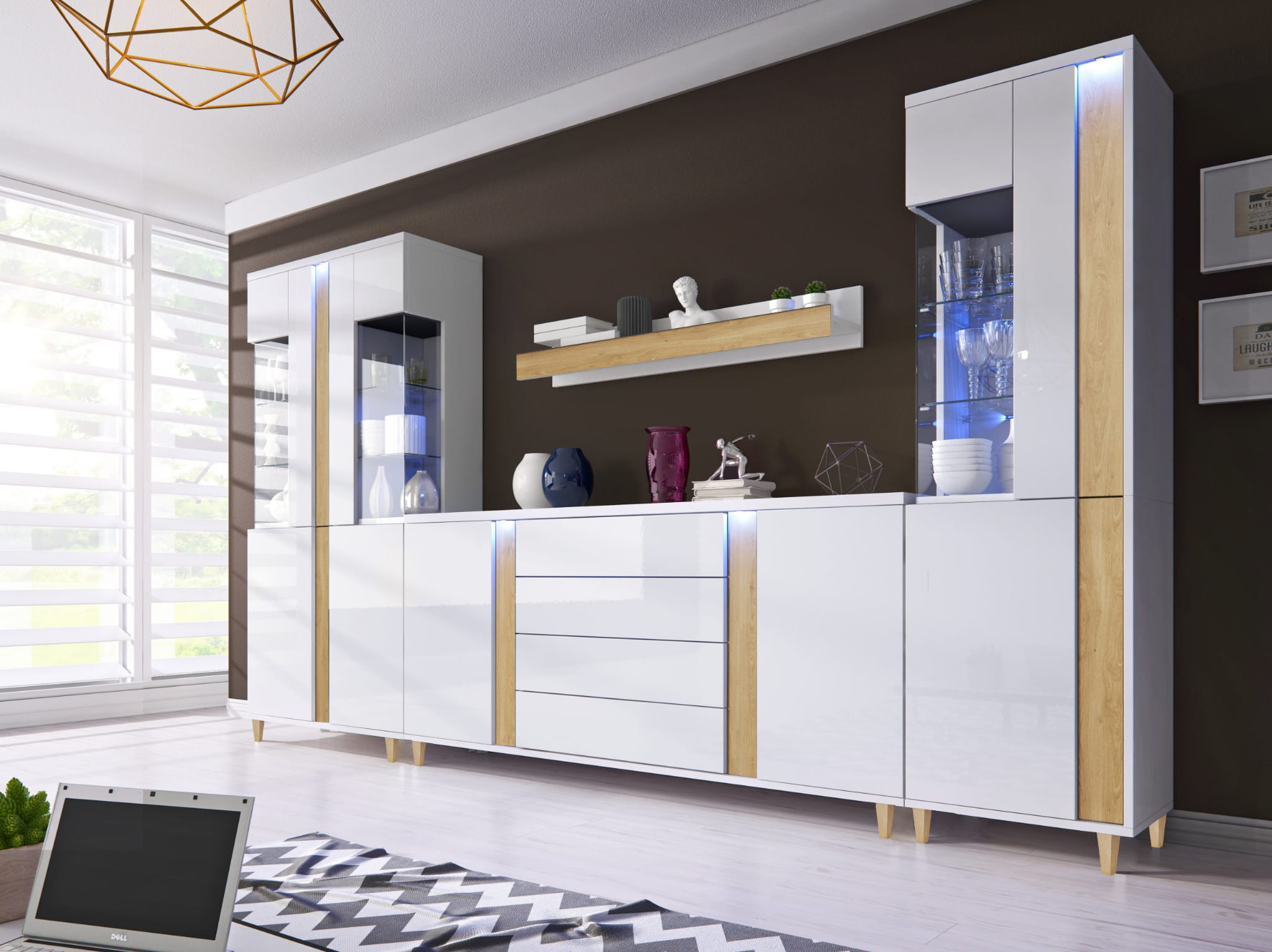 - Meblościanka składa się z: witryna duża, witryna duża prawa, półka oraz komoda 180.