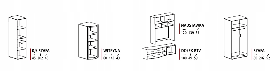 - Zestaw składa się z szafy 2D, nadstawki, dołku RTV, witryny oraz szafy 1D