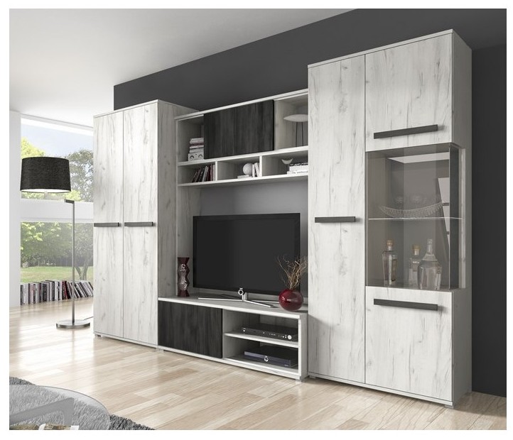 - Meblościanka SILVER dzięki połączeniu kolorów Dąb Craft Biały oraz Sosna Czarna odświeży Twój pokój. Drewniane, czarne uchwyty kontrastujące na jaśniejszych frontach powodują, że SILVER jest meblościanką subtelną. Dzięki podświetlanej, szklanej półce w witrynie możemy uzyskać niepowtarzalny wystrój w pokoju.