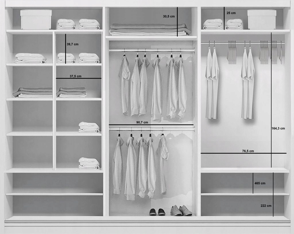 - Posiada w swoim wnętrzu 3 drążki na wieszaki oraz półki