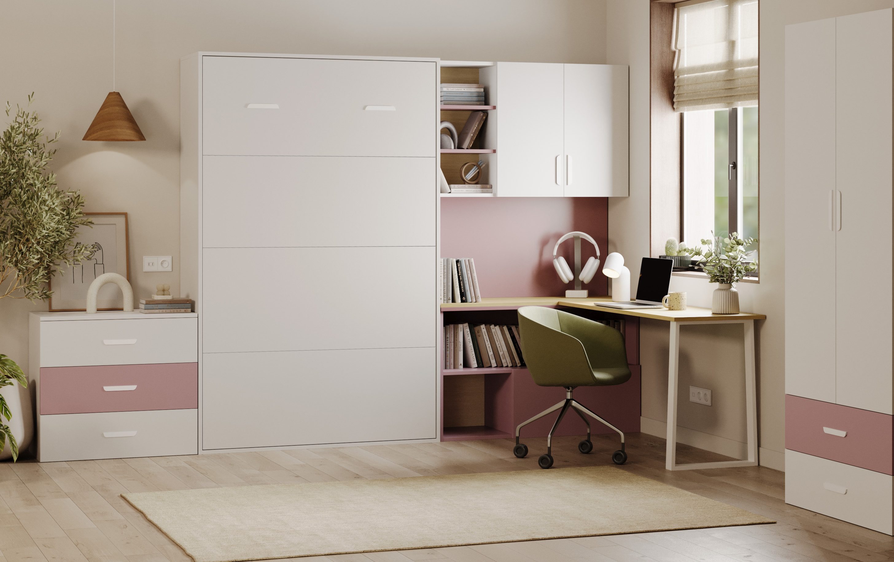Dzięki możliwości montażu biurka po prawej lub lewej stronie, LUMI z łatwością dopasuje się do każdego wnętrza, niezależnie od jego układu. To doskonały wybór do kawalerek, salonów, pokoi młodzieżowych i dziecięcych, czyli wszędzie tam, gdzie liczy się każdy metr przestrzeni.