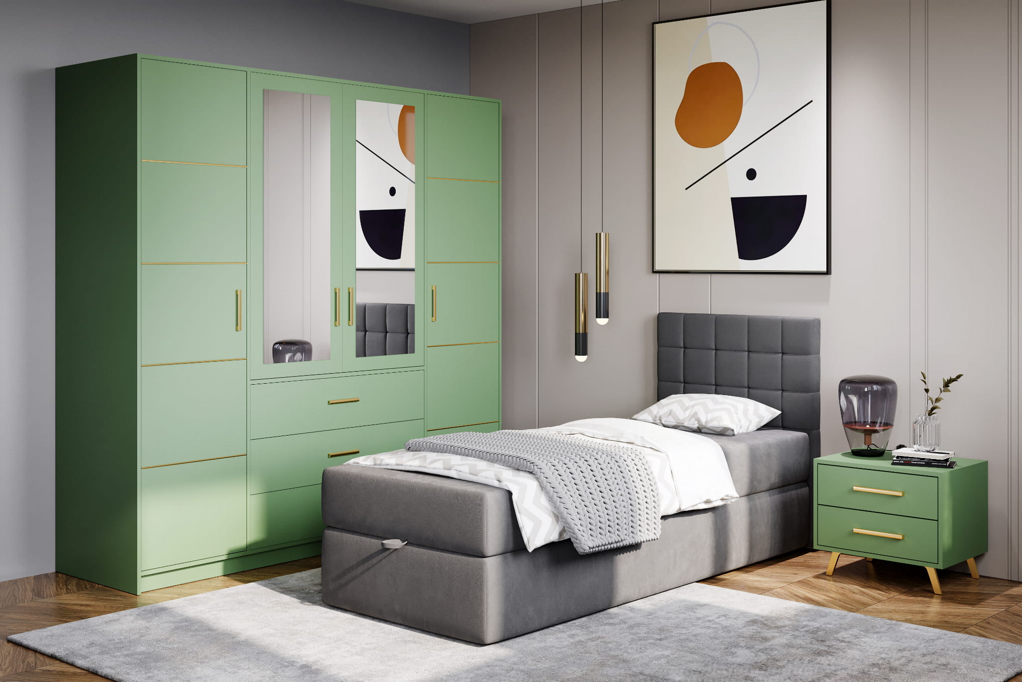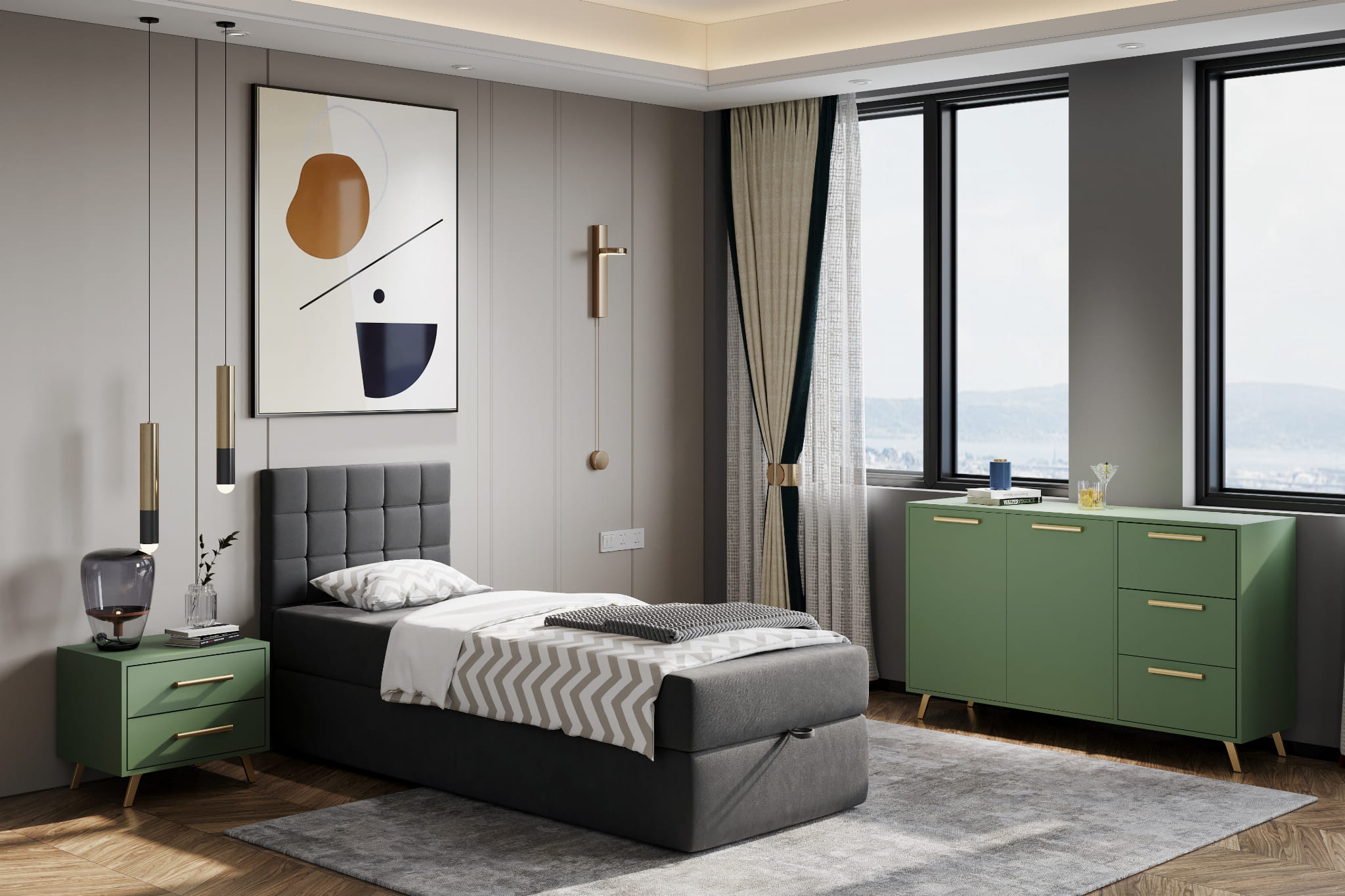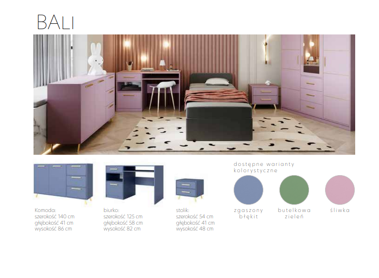 Szafka nocna BALI z dwiema szufladami. Wykonane jest z płyty laminowanej o grubości 16 mm o podwyższonej odporności na zarysowania. Płyta laminowana odporna na zarysowania, uszkodzenia, wilgoć i wysoką temperaturę. Uchwyty w kolorze złotym. Obrzeża wykończone całkowicie okleiną ABS. Meble w paczkach do samodzielnego montażu. Do mebli dołączamy instrukcję oraz wszystkie niezbędne akcesoria.