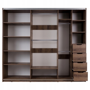 - Szafa posiada w swoim wnętrzu 4 drążki na wieszaki, szuflady oraz półki