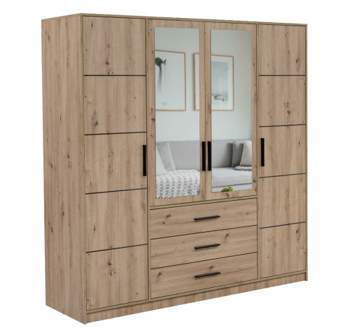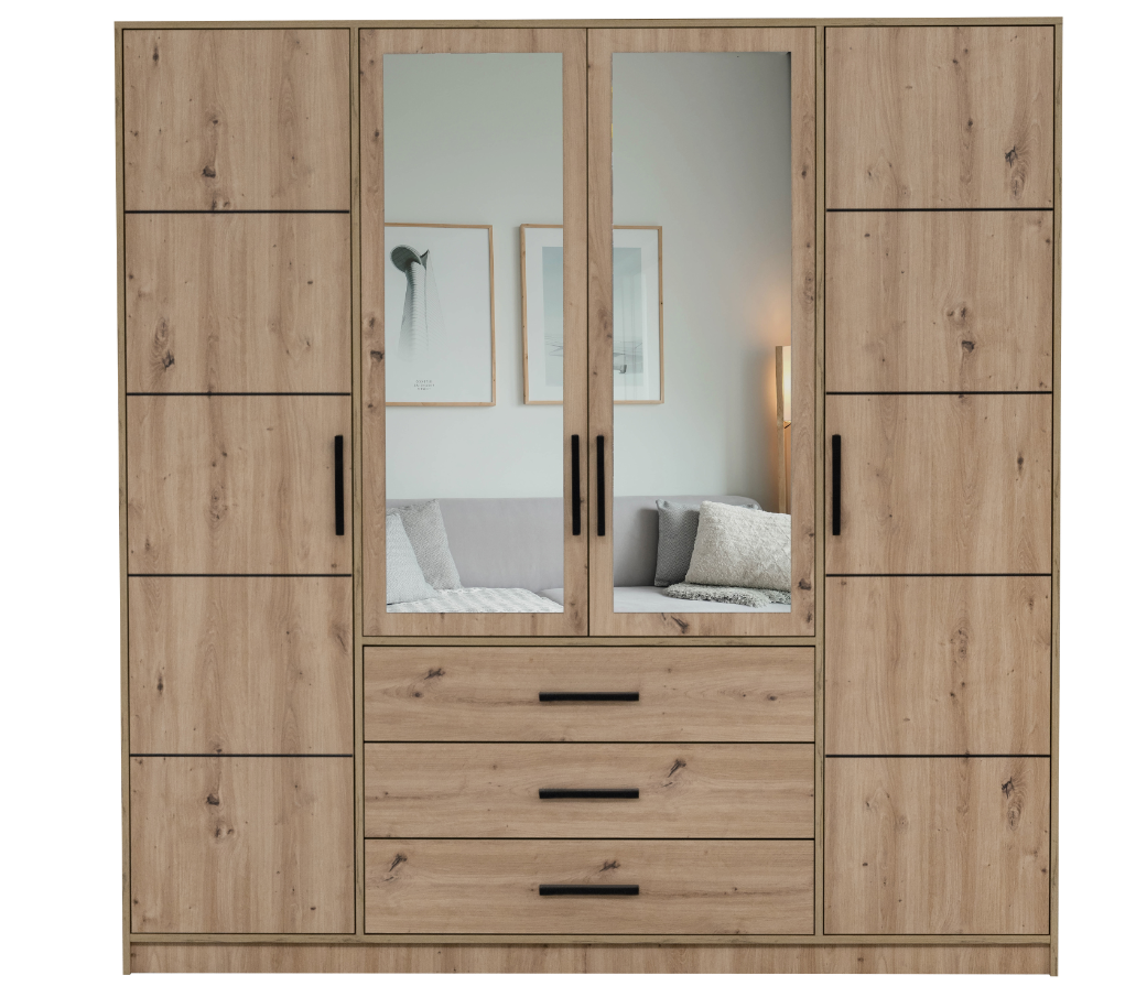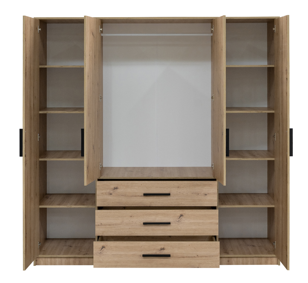- Szafa posiada czworo drzwi otwieranych, za którymi znajdują się półki i drążek na wieszaki.