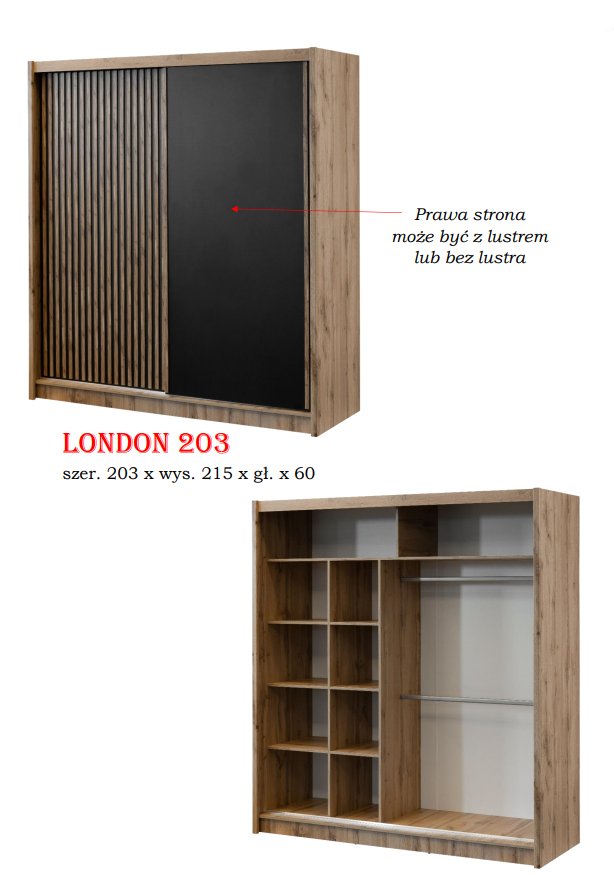 - Szafa przesuwna LONDON 203 jest nowoczesną propozycją, która pasuje zarówno do stylu indystriualnego, nowoczesnego czy lofotwego.