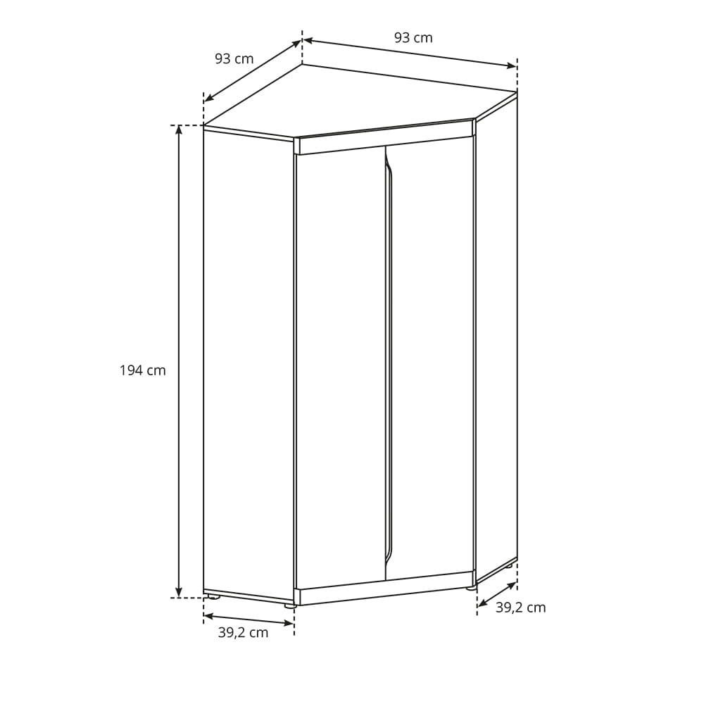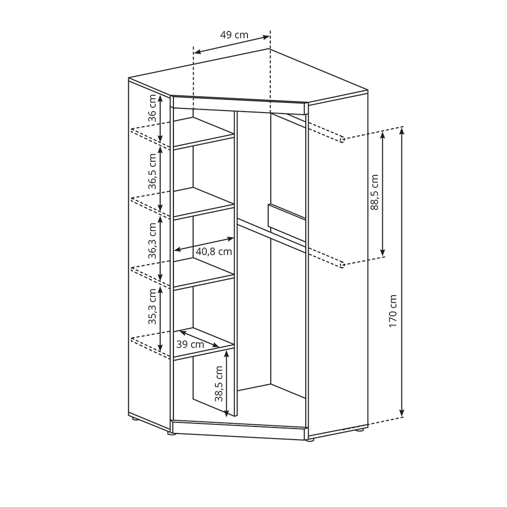 - Szafa narożna posiada dwoje uchylnych drzwi oraz bogato wyposażone wnętrze.