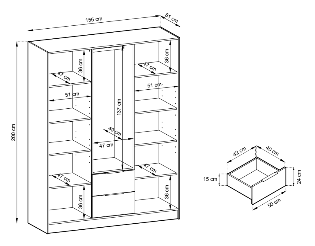 - Posiada 2 szuflady oraz 3 otwierane fronty z półkami i drążkiem na wieszaki.