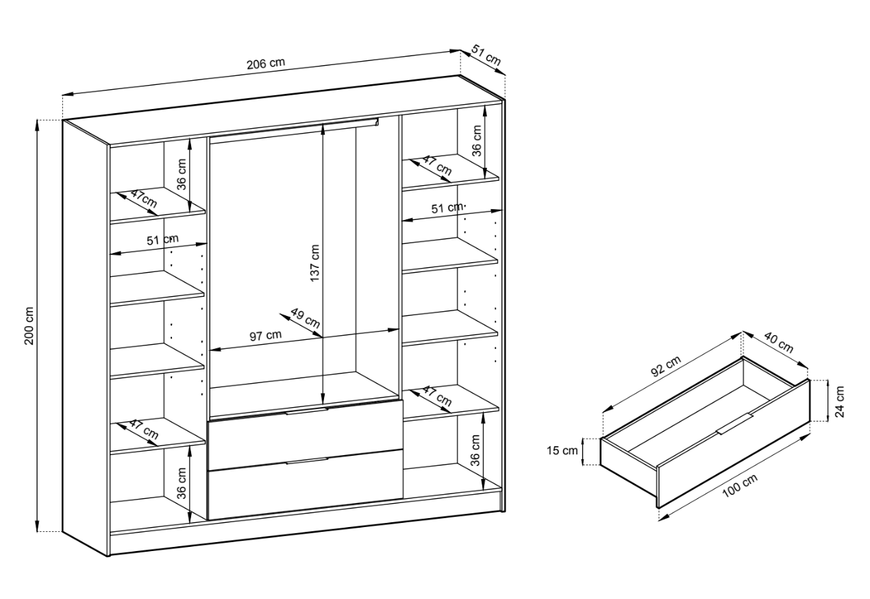 - W swoim wnętrzu posiada drążek na wieszaki oraz półki.