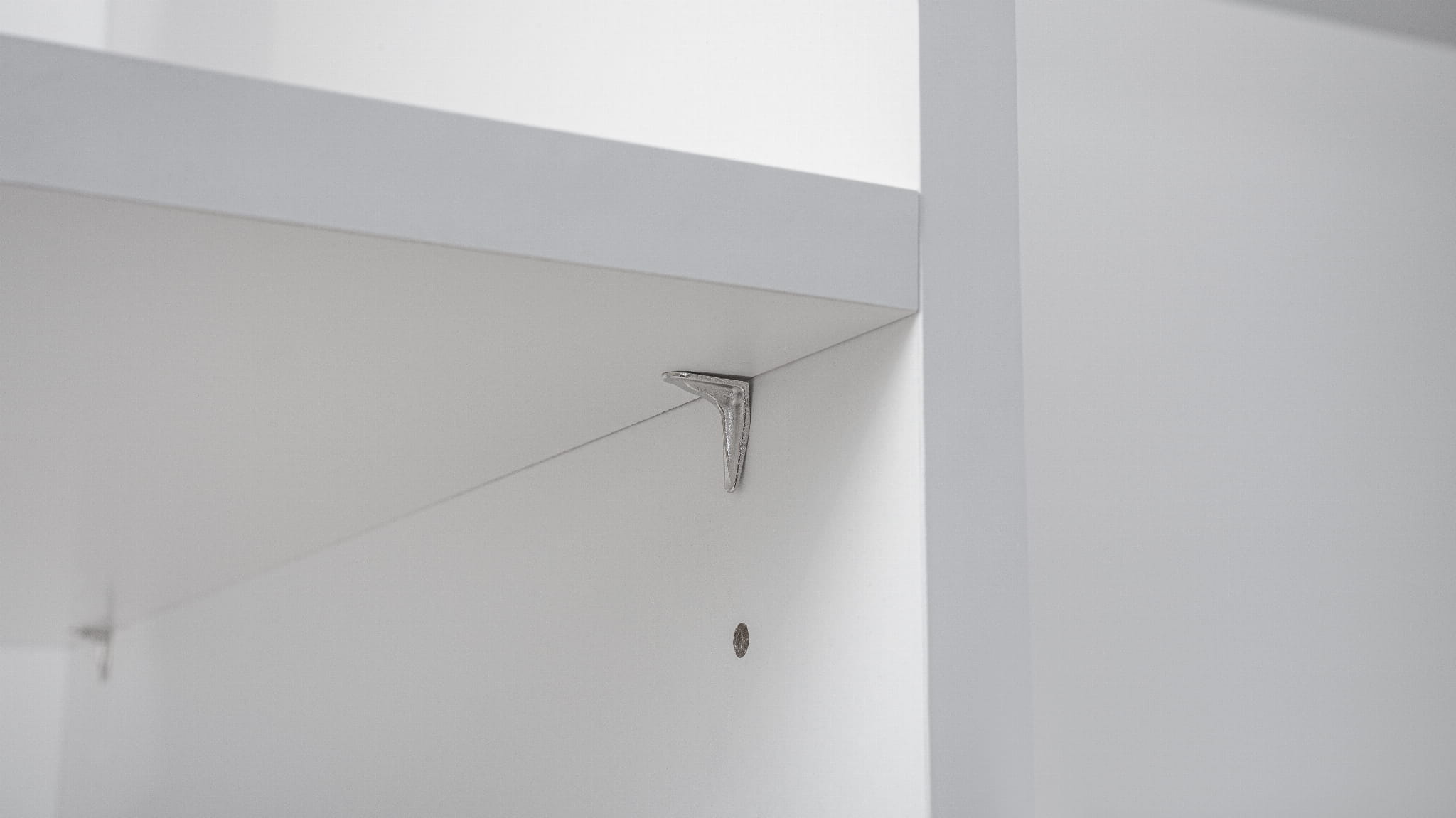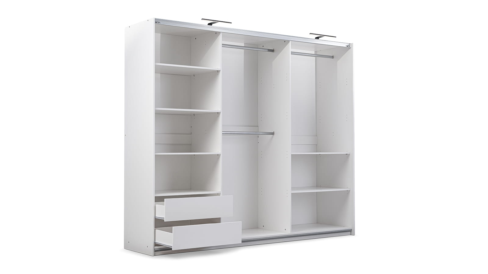 • W swoim wnętrzu szafa posiada miejsce na wieszaki oraz półki pośrodku.