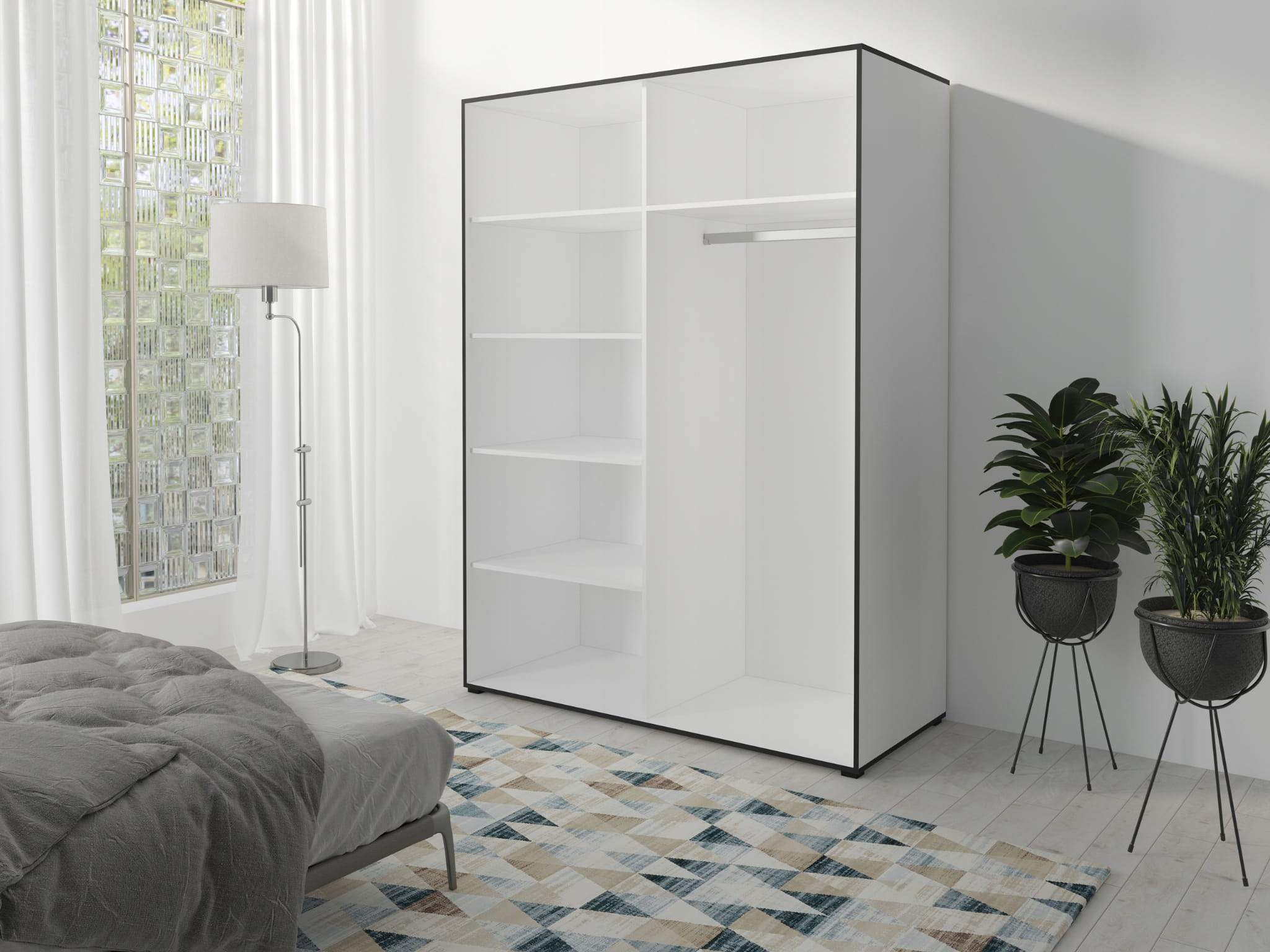 - Wewnątrz szafy znajdują się drążki na ubrania oraz pojemne półki.