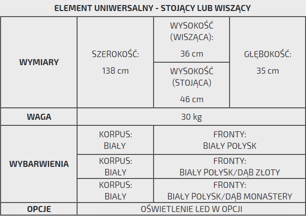 - Szafka jest elementem uniwersalnym - stojąca lub wisząca ( w zestawie nóżki )