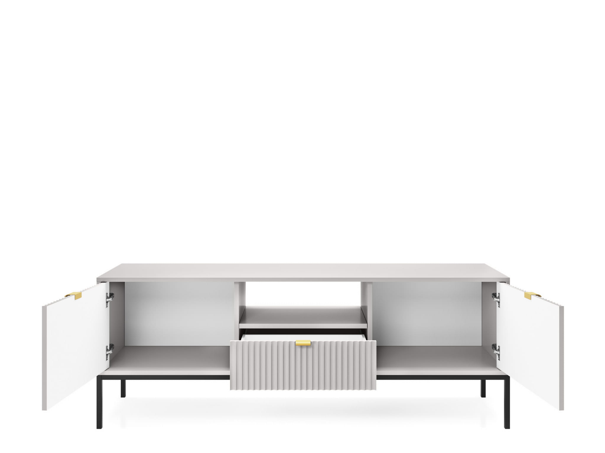 - Uchwyty aluminiowe złote. Posiada dwa uchylne fronty oraz szufladę.