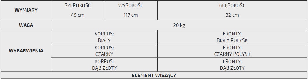 - Szafka jest elementem wiszącym, posiada 1 drzwi uchylne