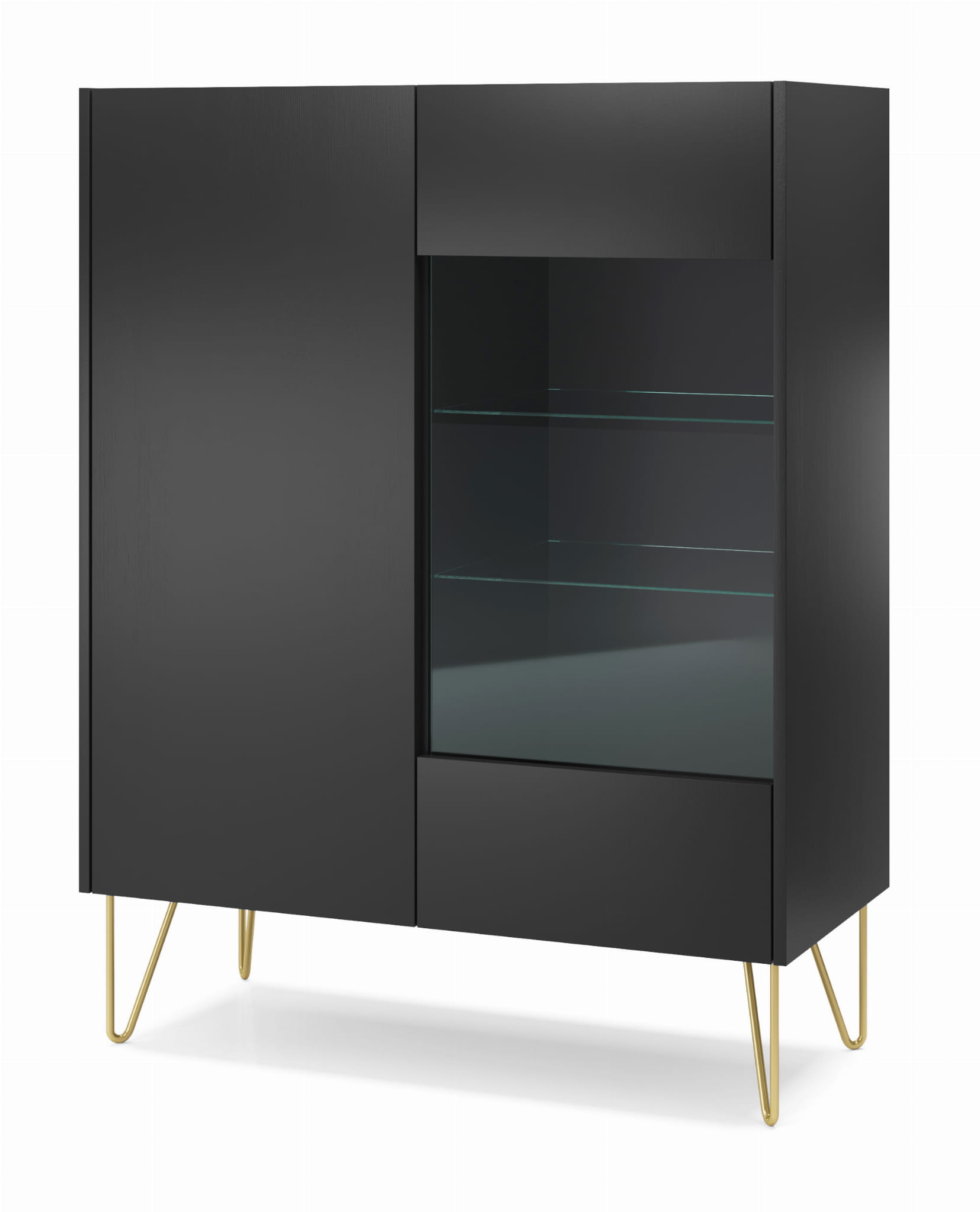 - Witryna posiada dwa uchylne fronty. W środku posiada półki (w tym dwie szklane).