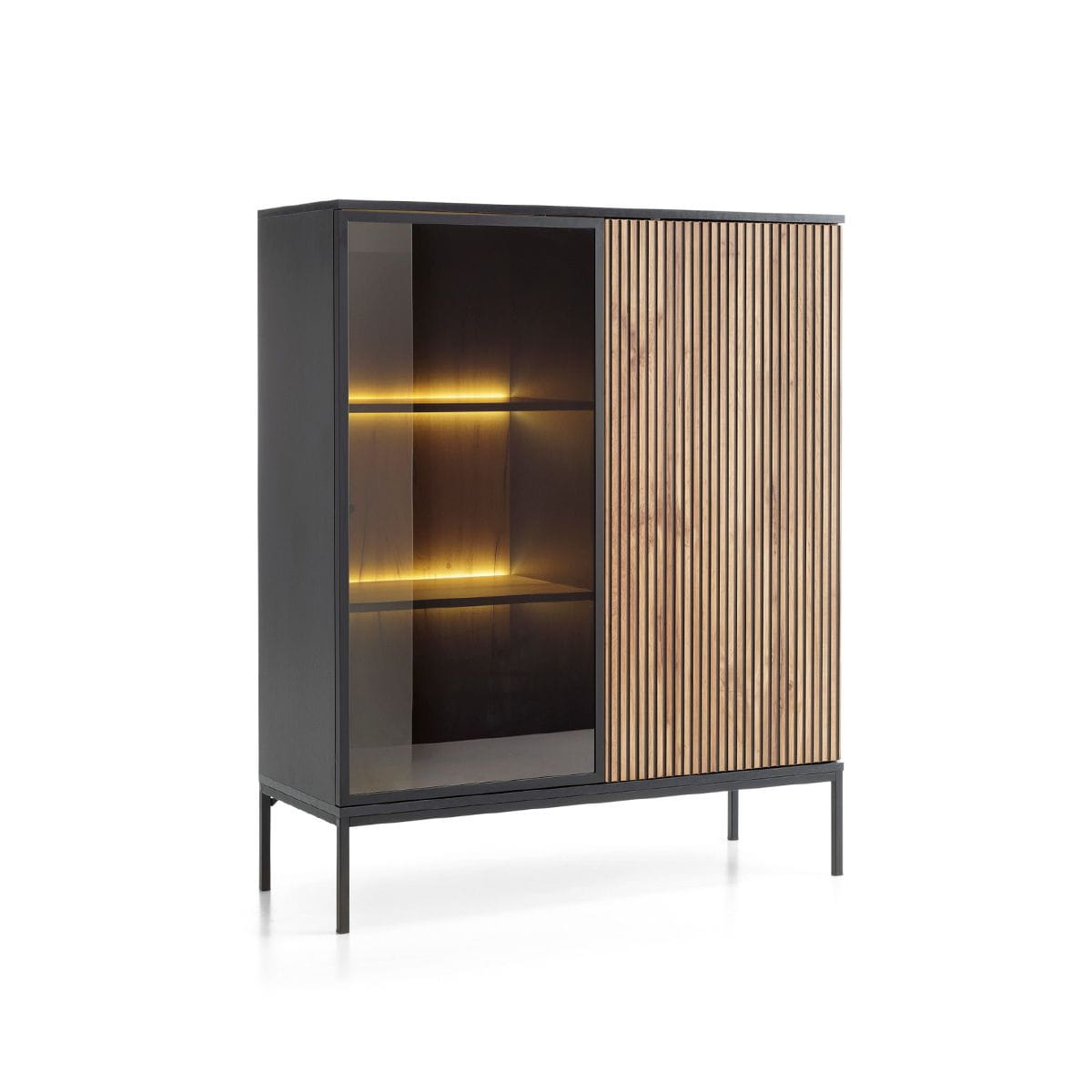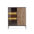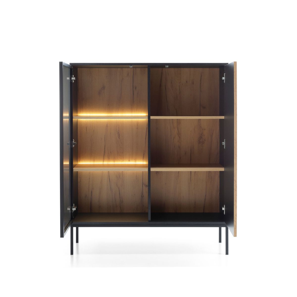 - Witryna jest dodatkowo wyposażona w oświetlenie LED, które podkreśla jej design i stanowi praktyczne źródło światła w pomieszczeniu.