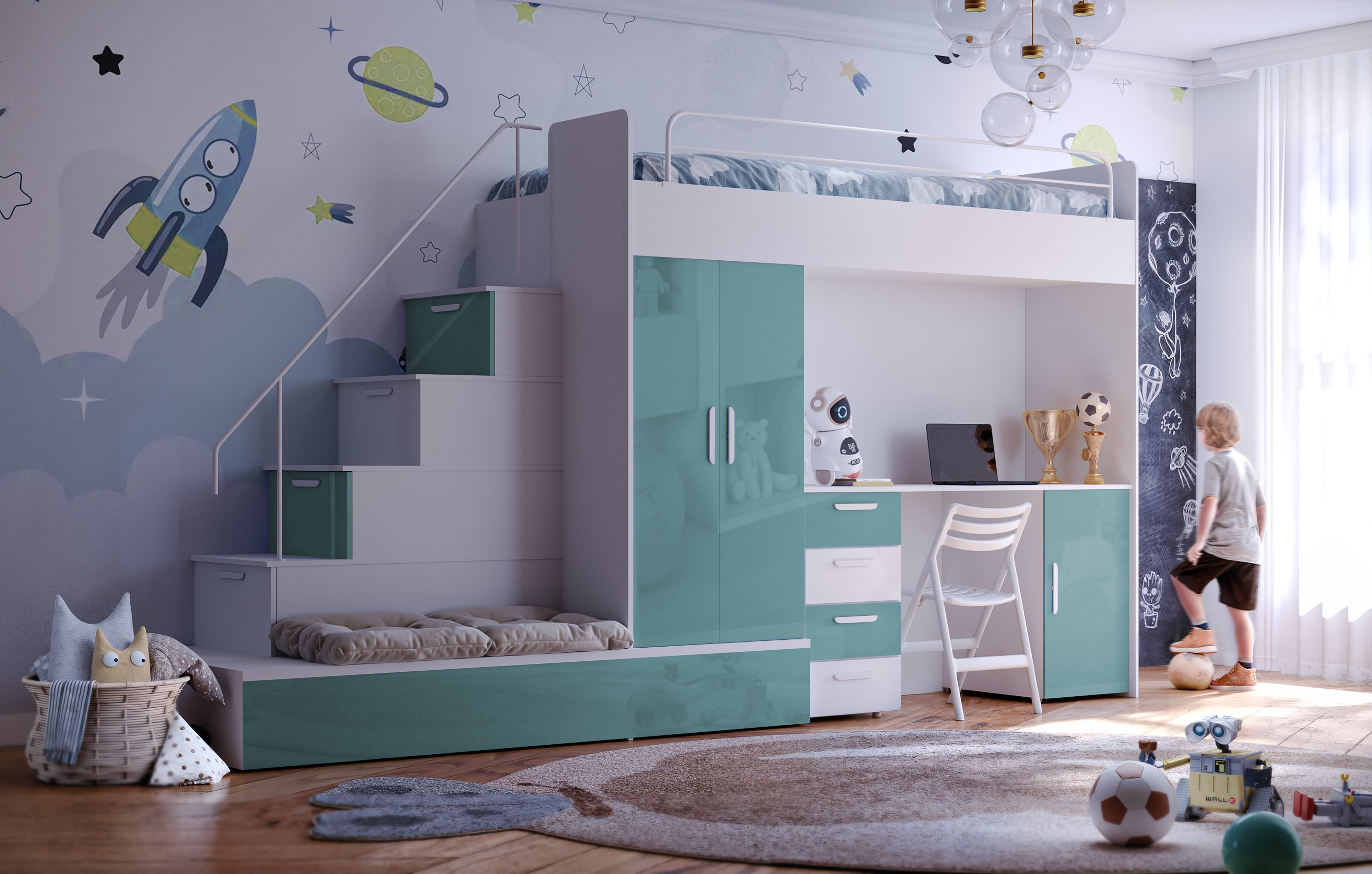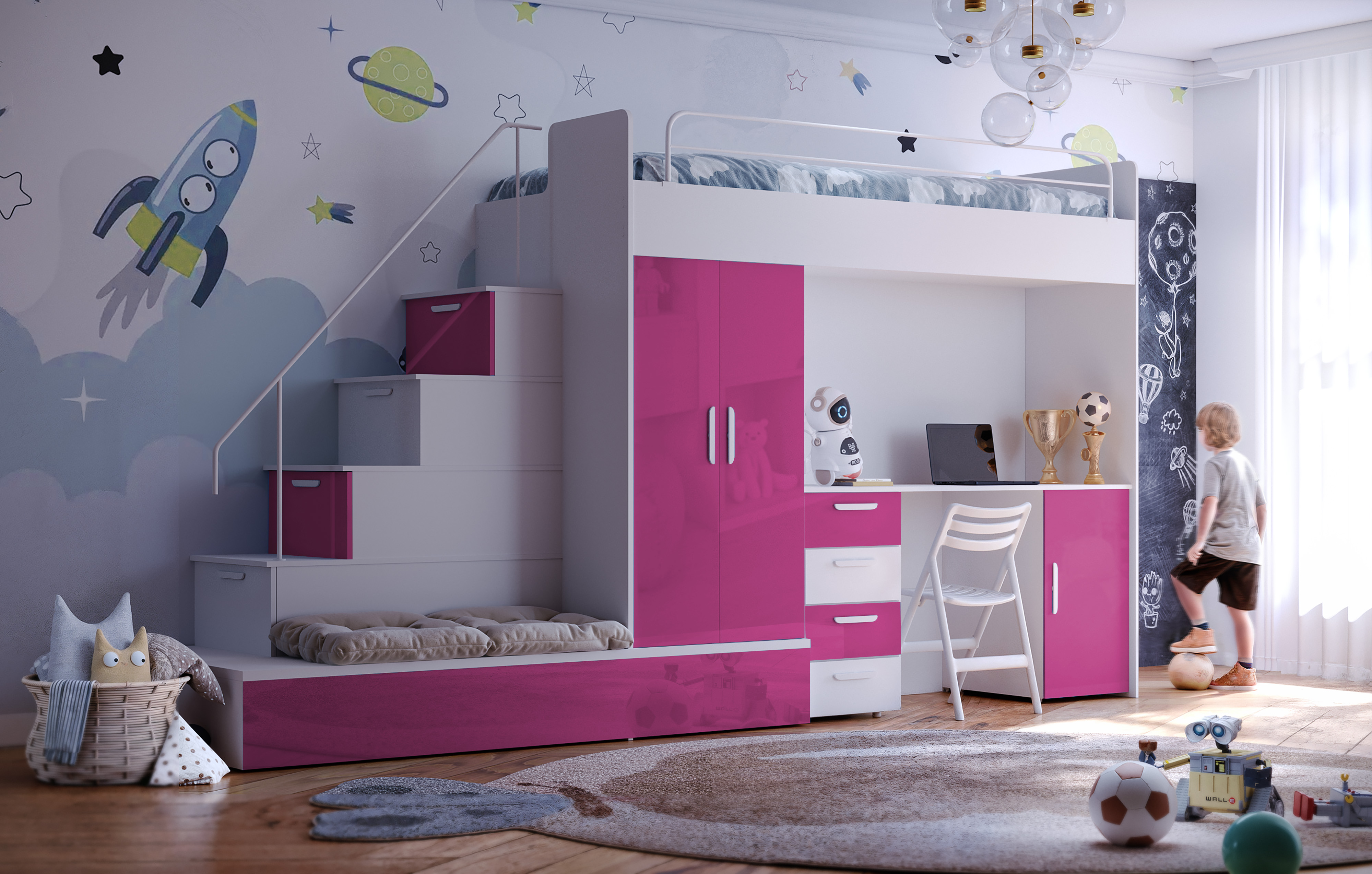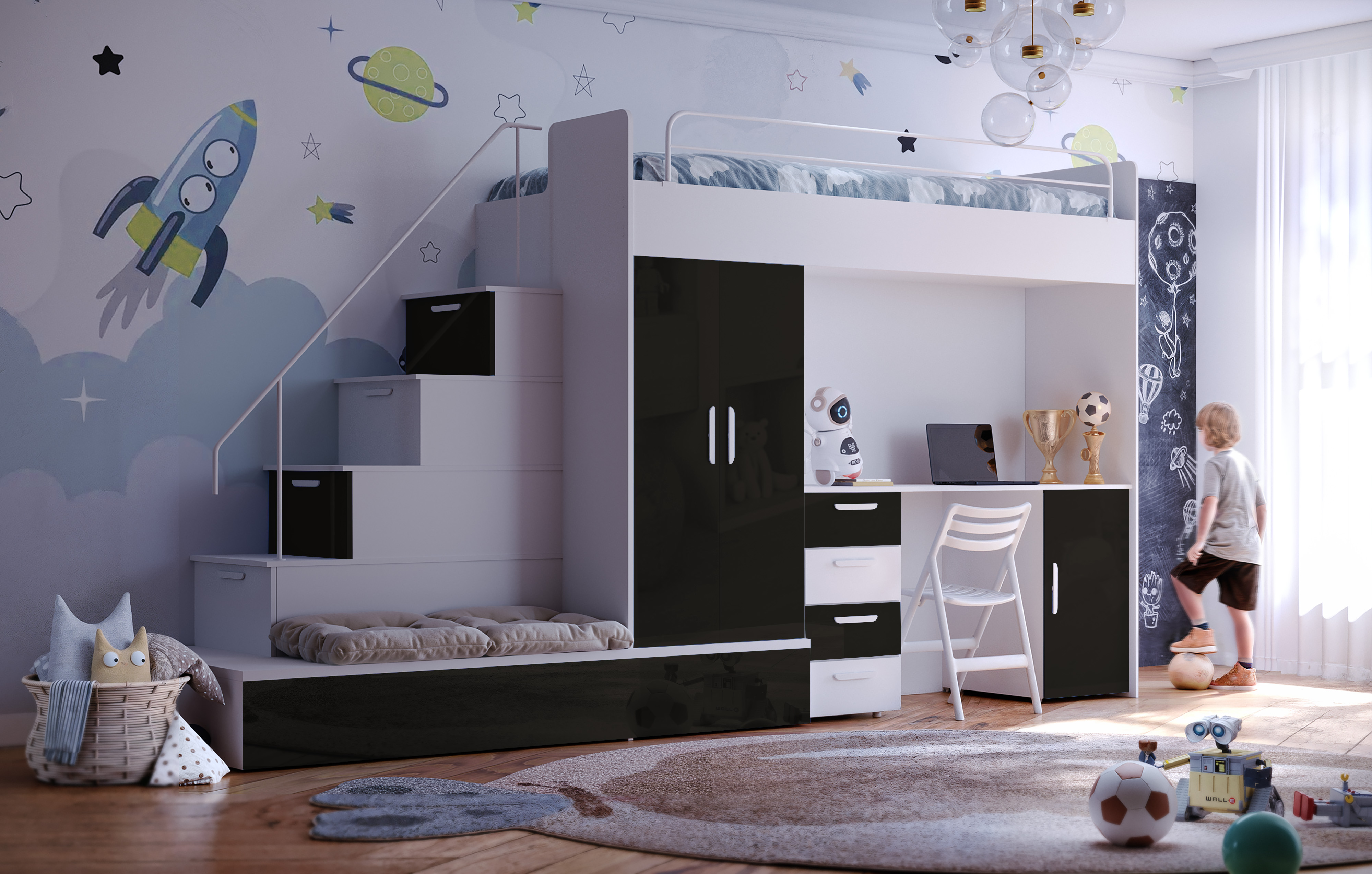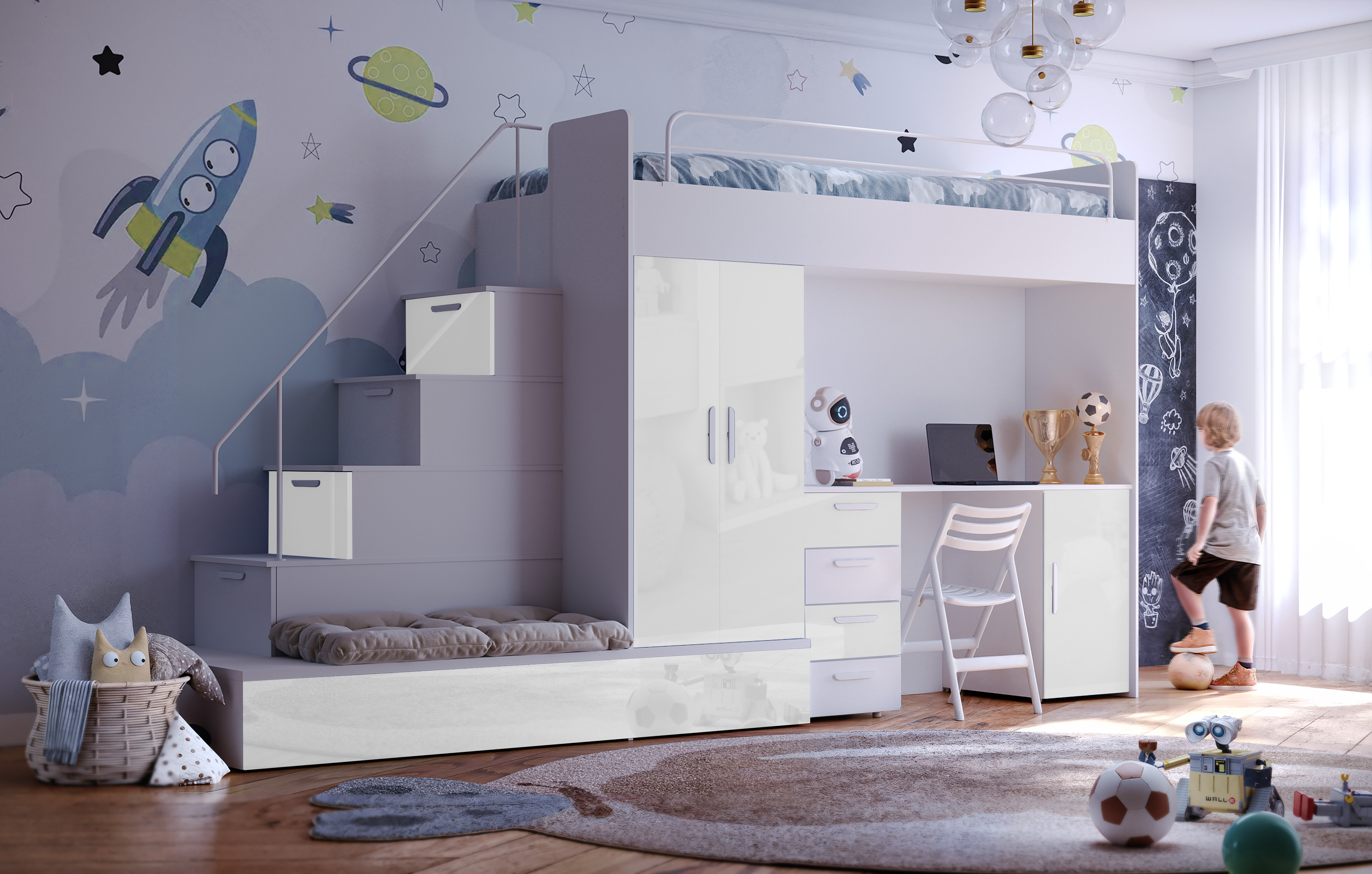Praktyczne miejsce do nauki, zabawy i codziennej aktywności. - Przestronna szafa i schodki z półkami