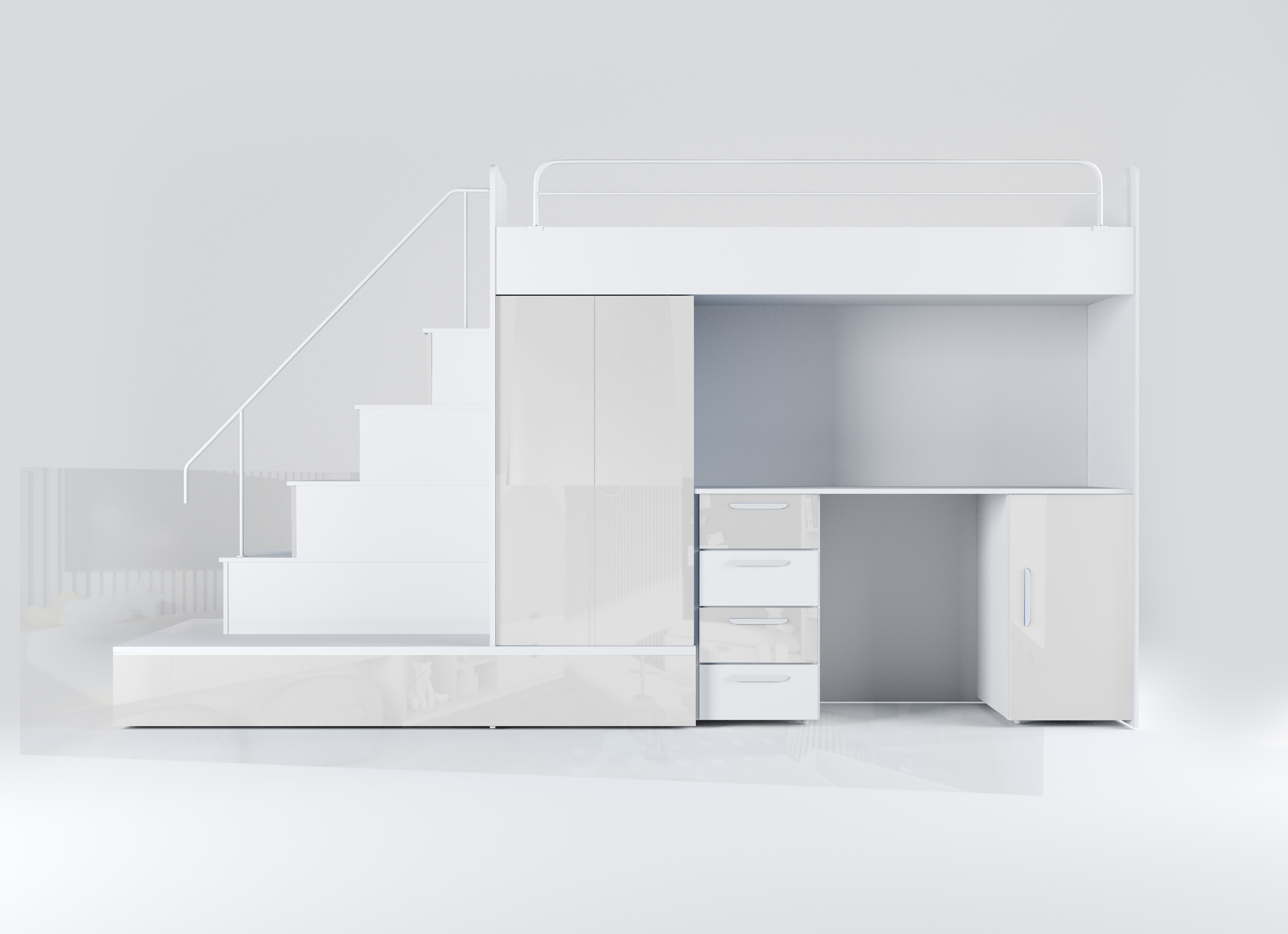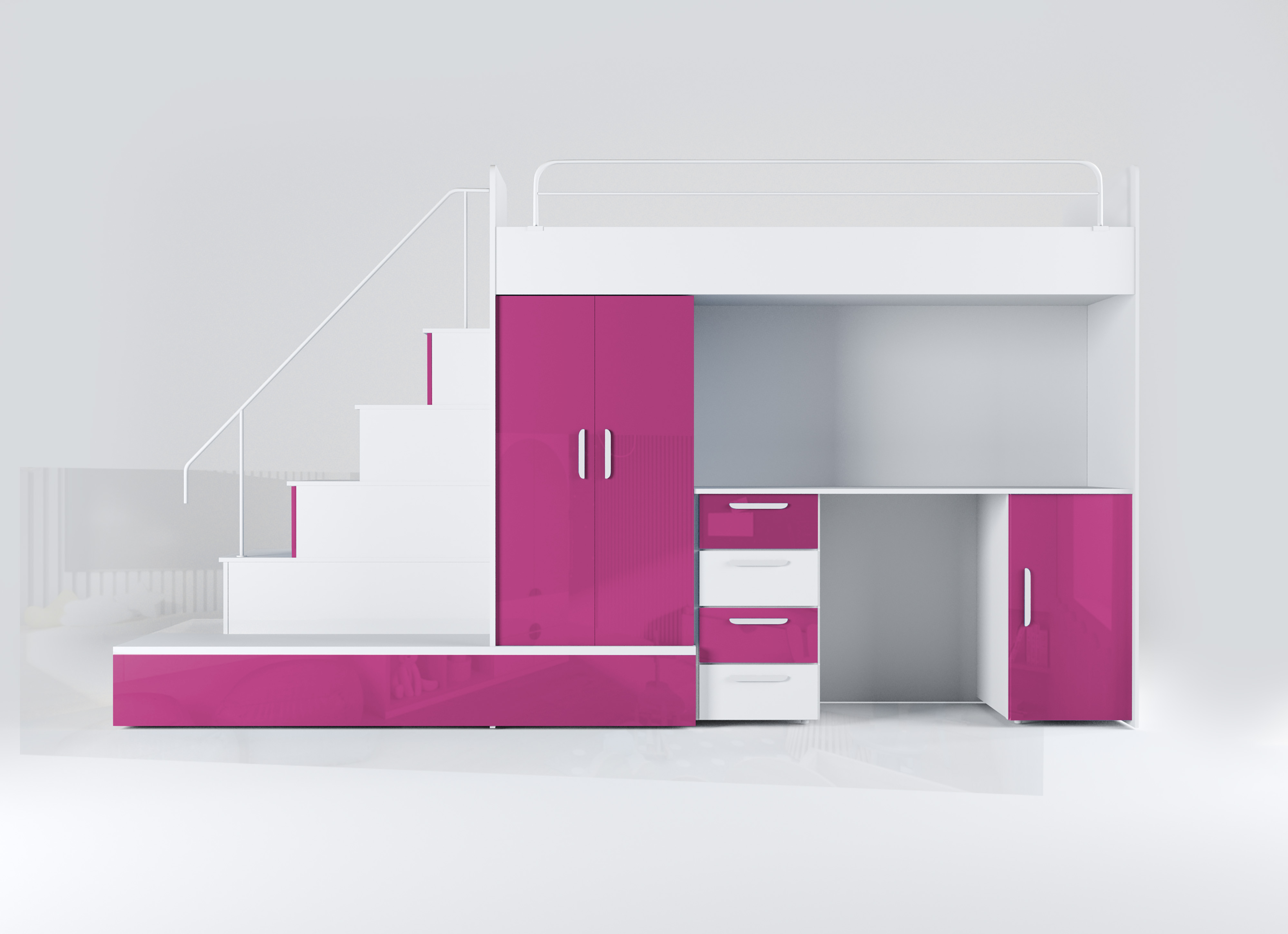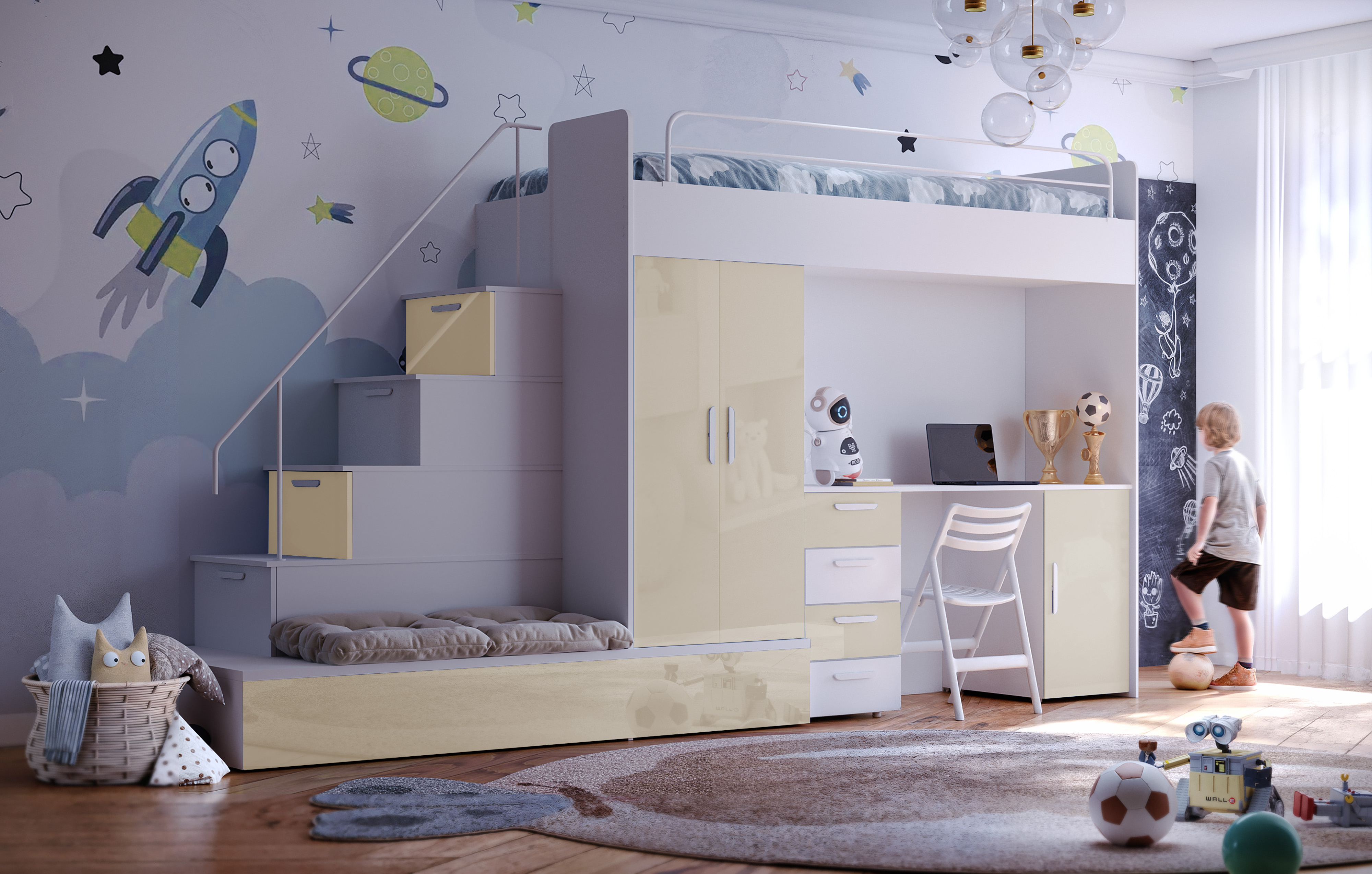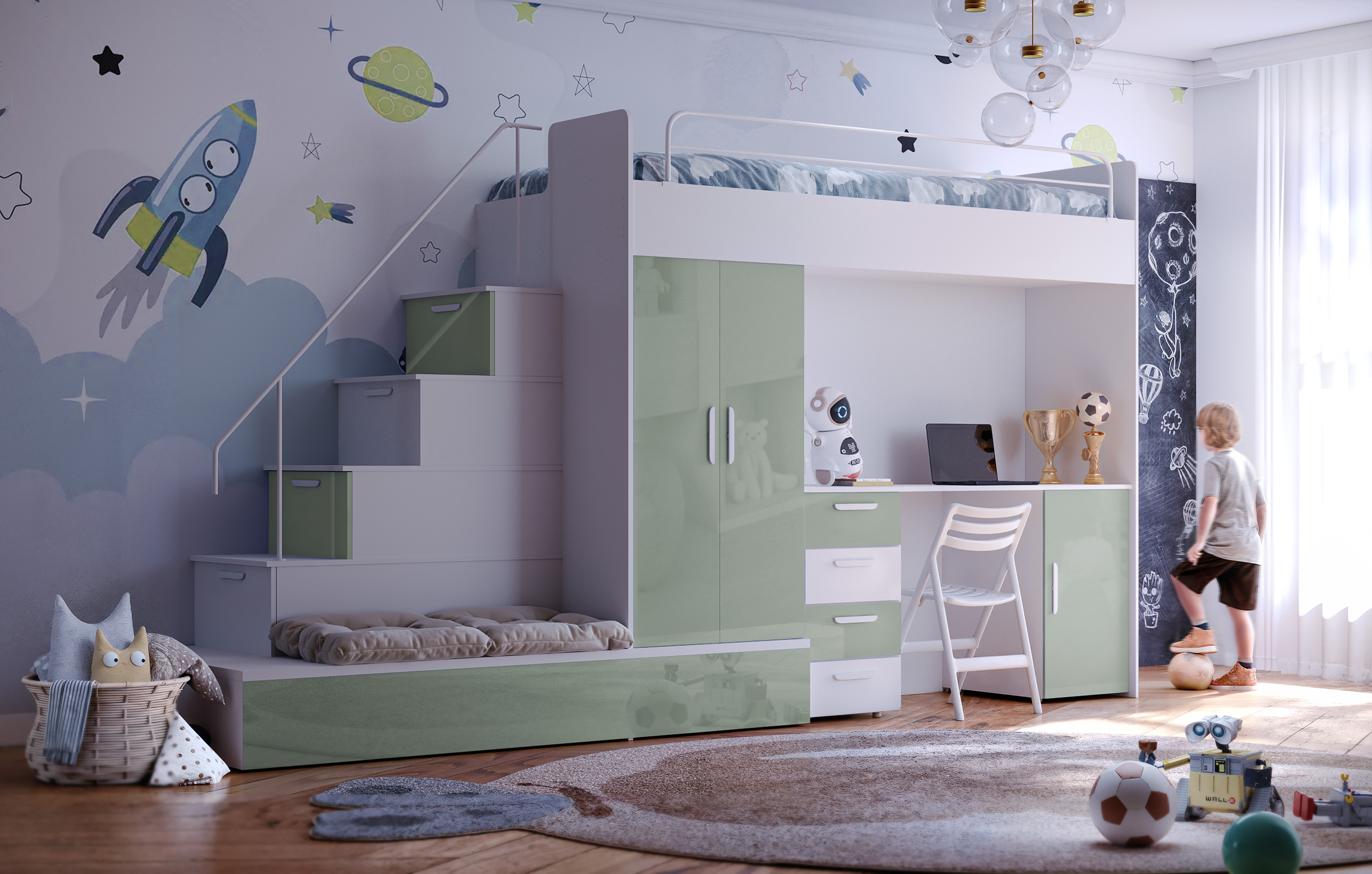 Praktyczne miejsce do nauki, zabawy i codziennej aktywności. - Przestronna szafa i schodki z półkami