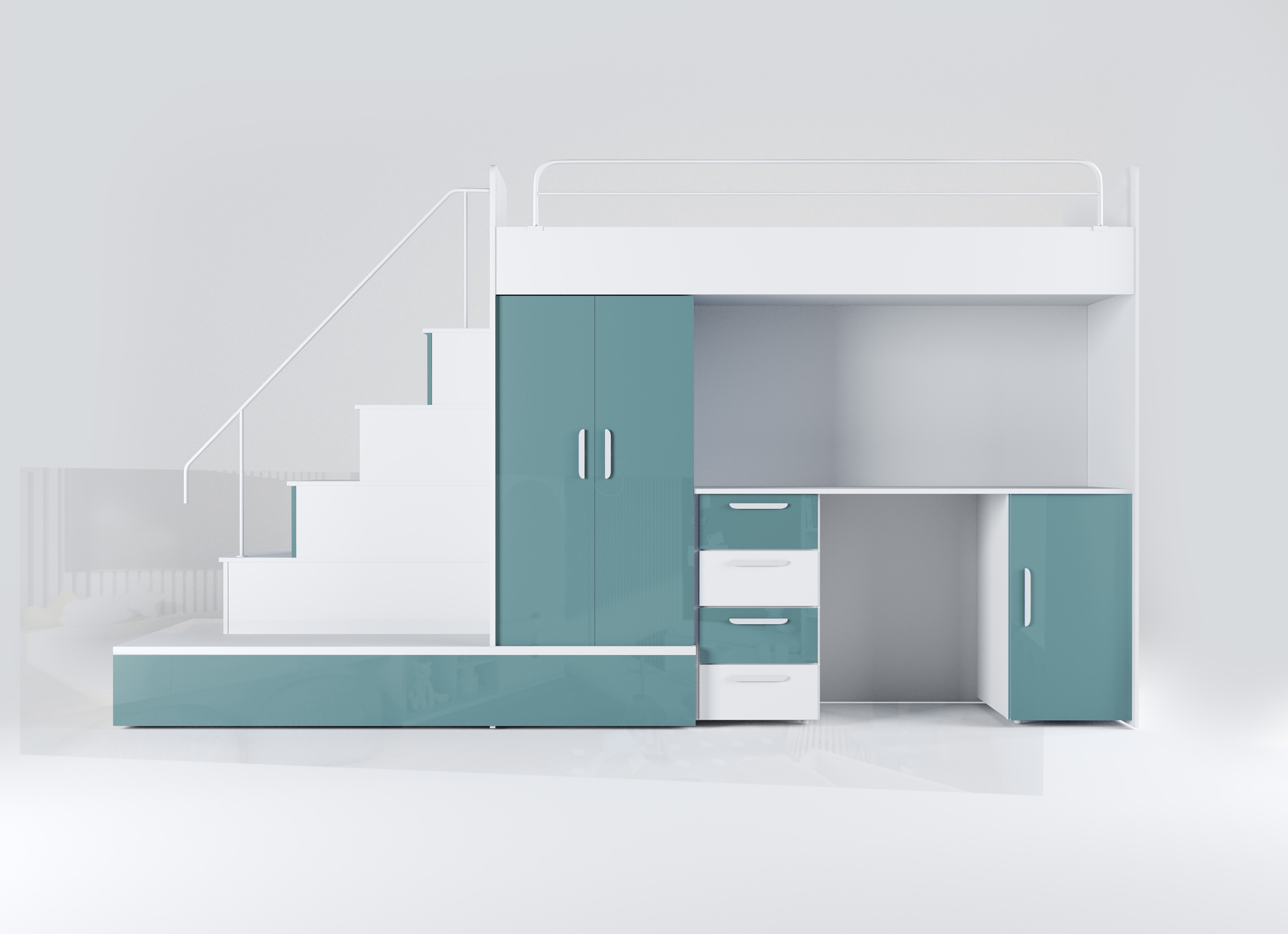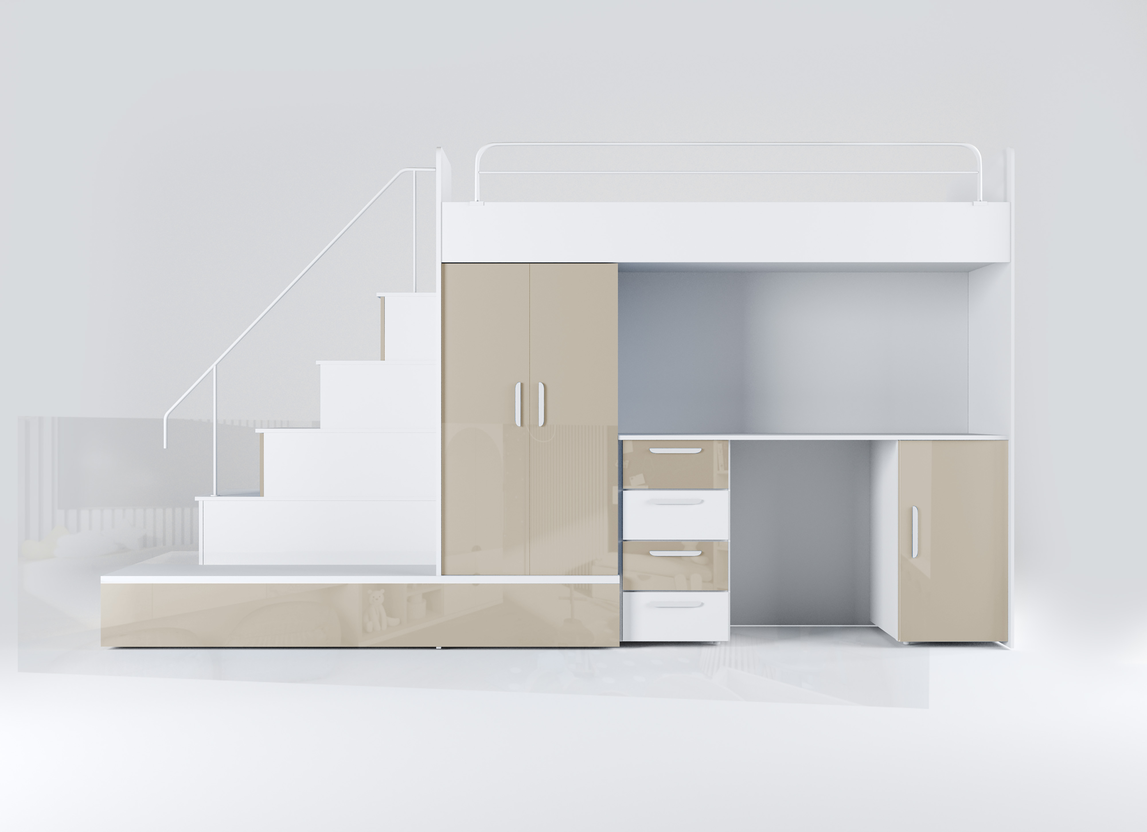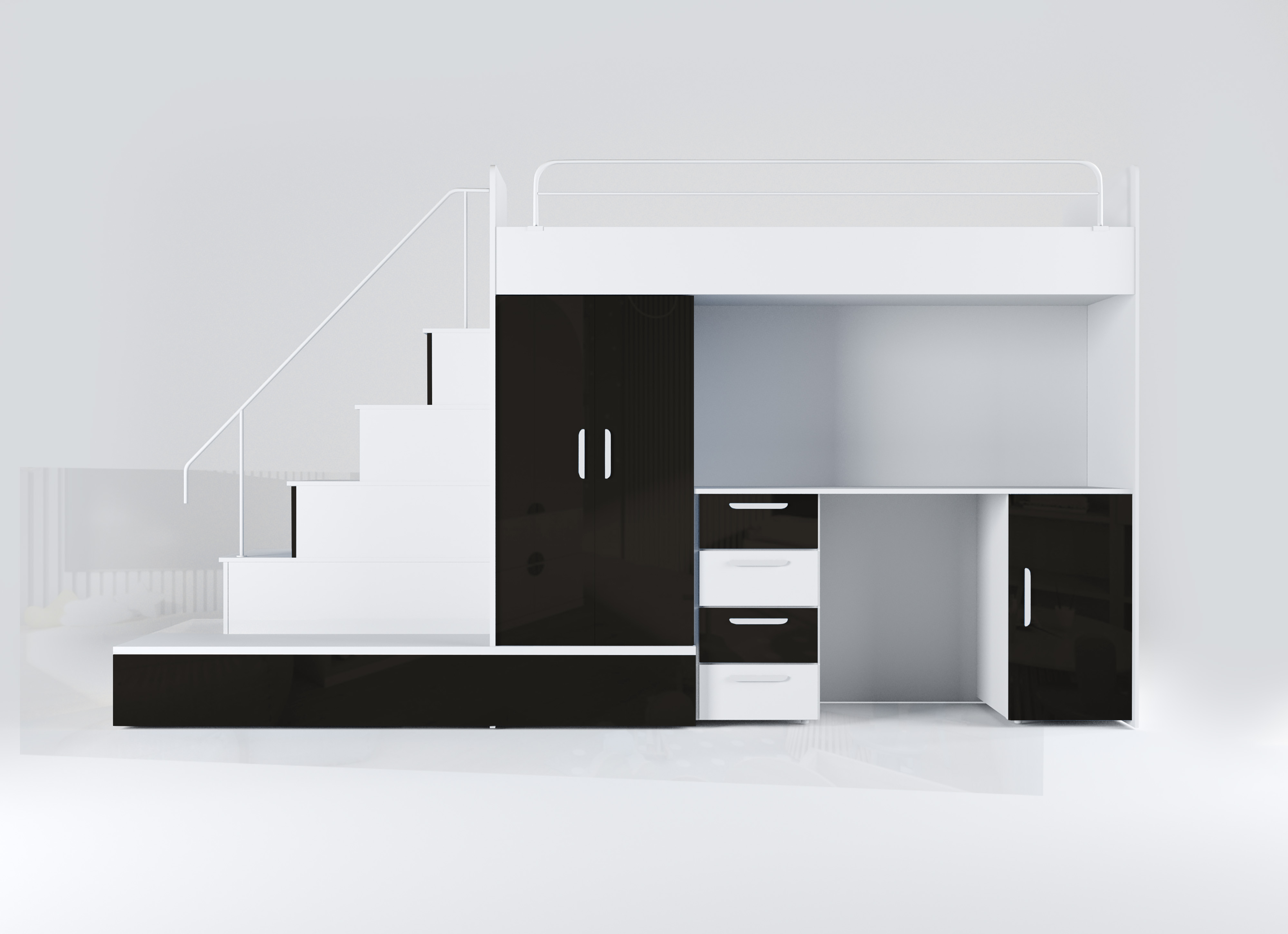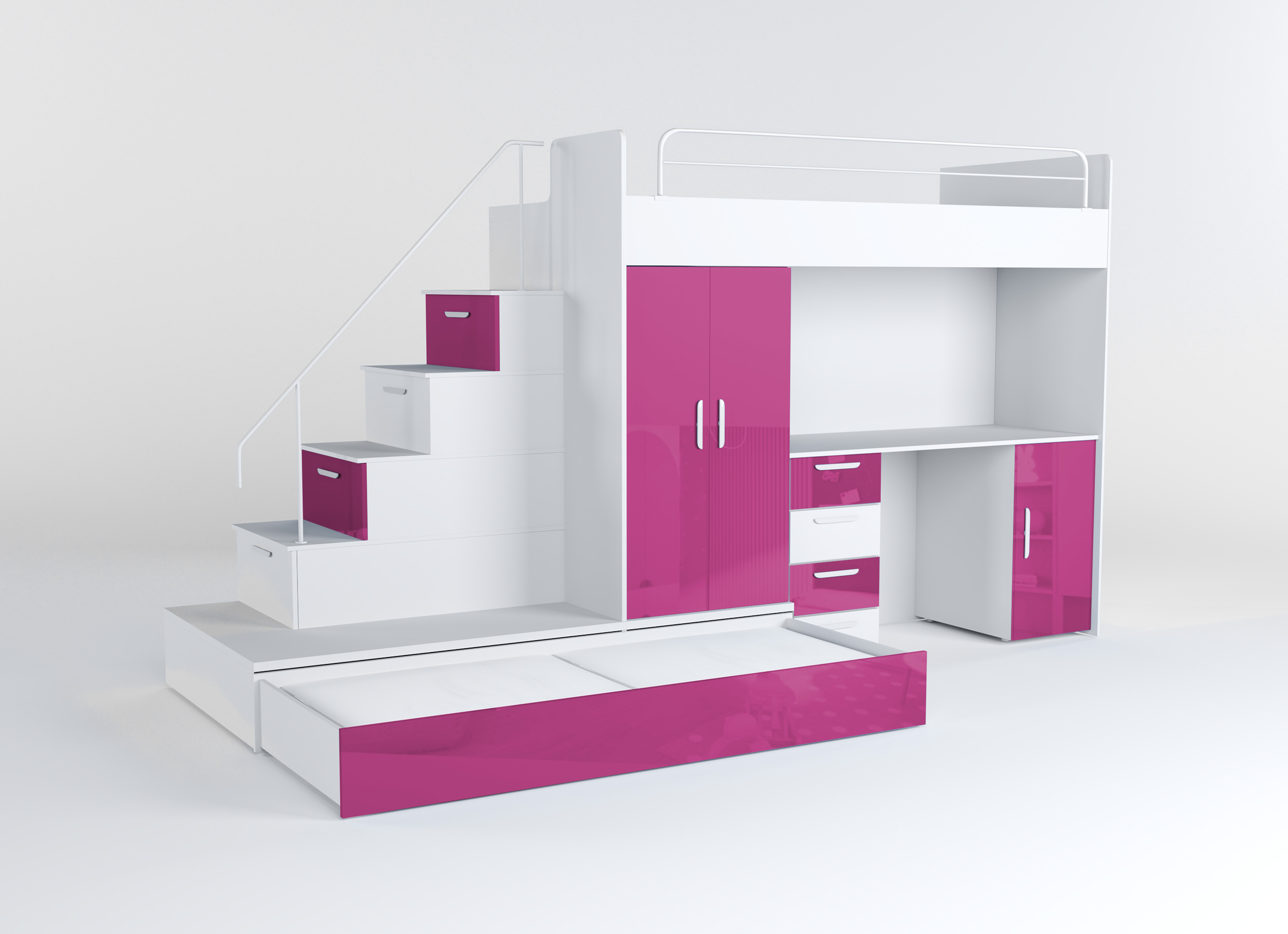 Praktyczne miejsce do nauki, zabawy i codziennej aktywności. - Przestronna szafa i schodki z półkami