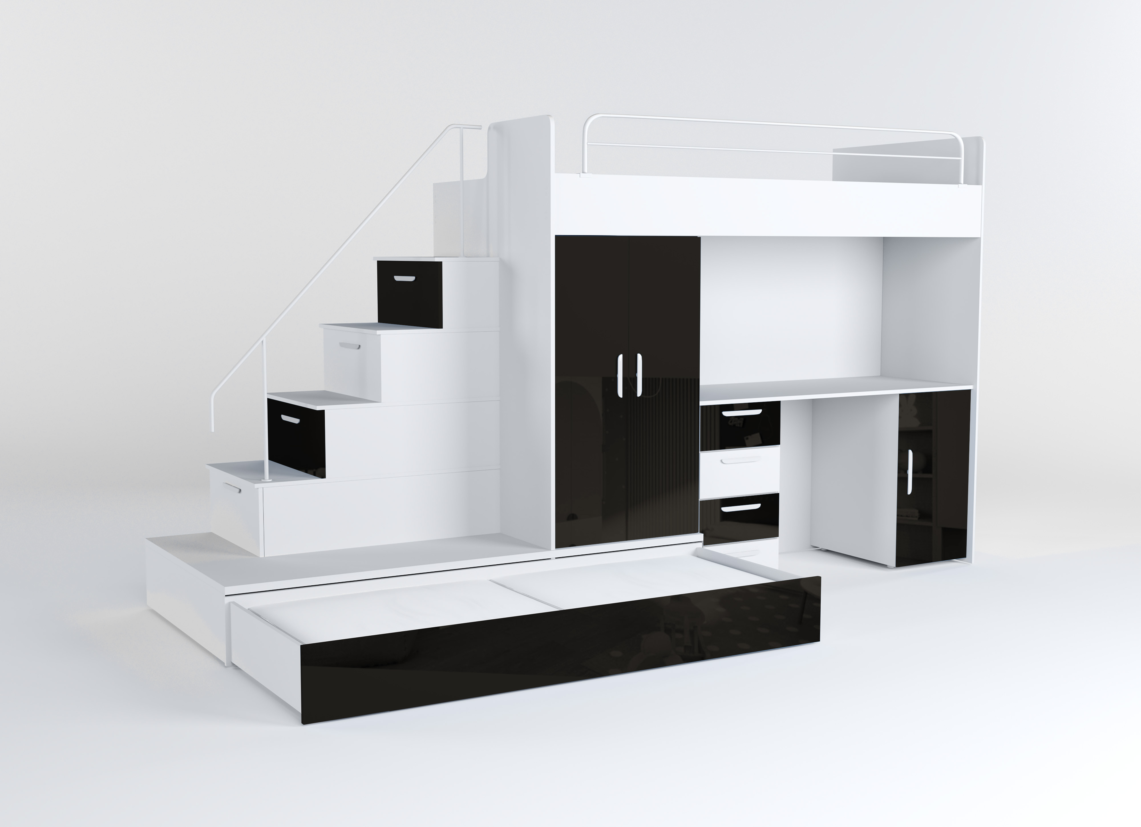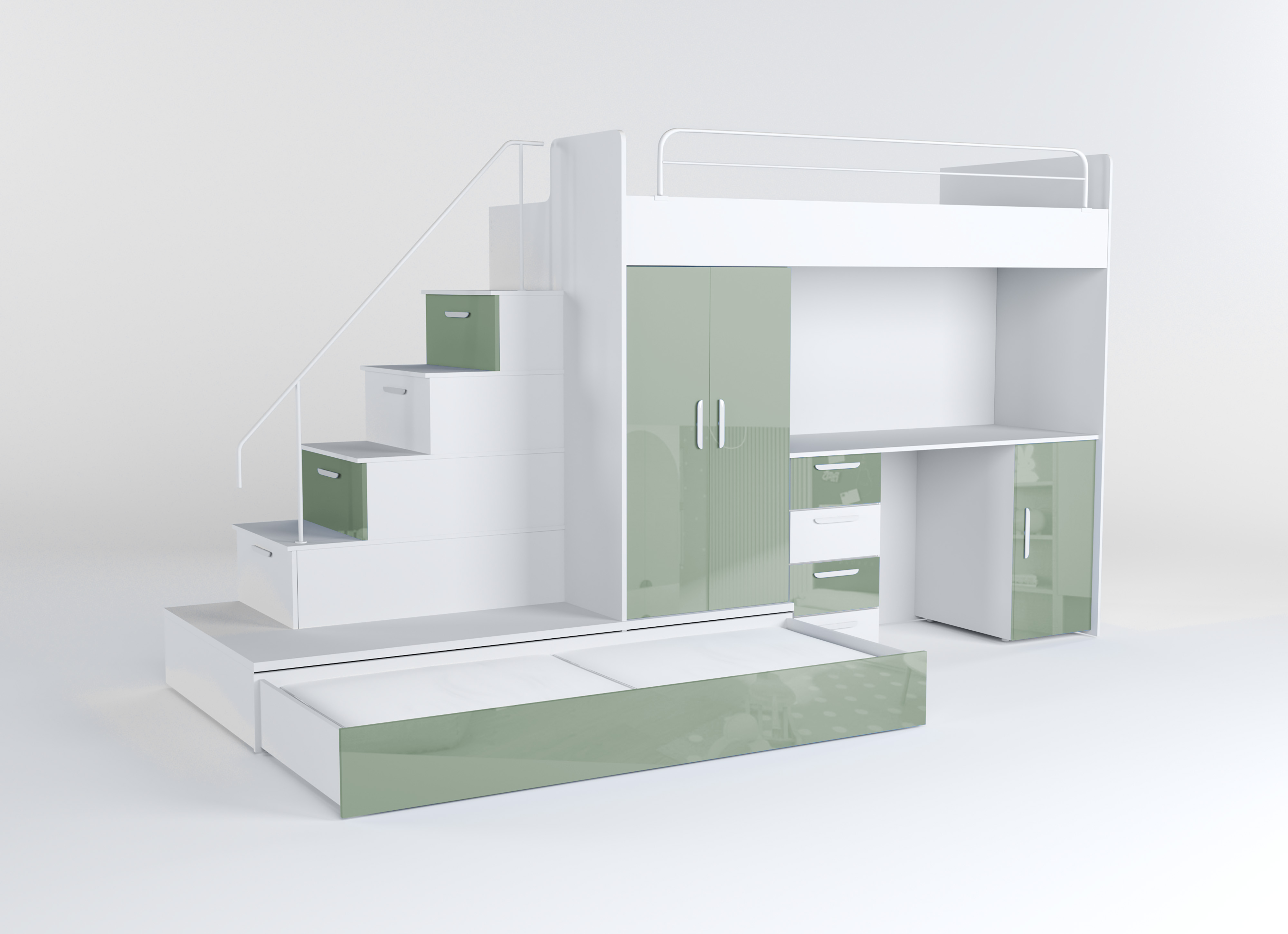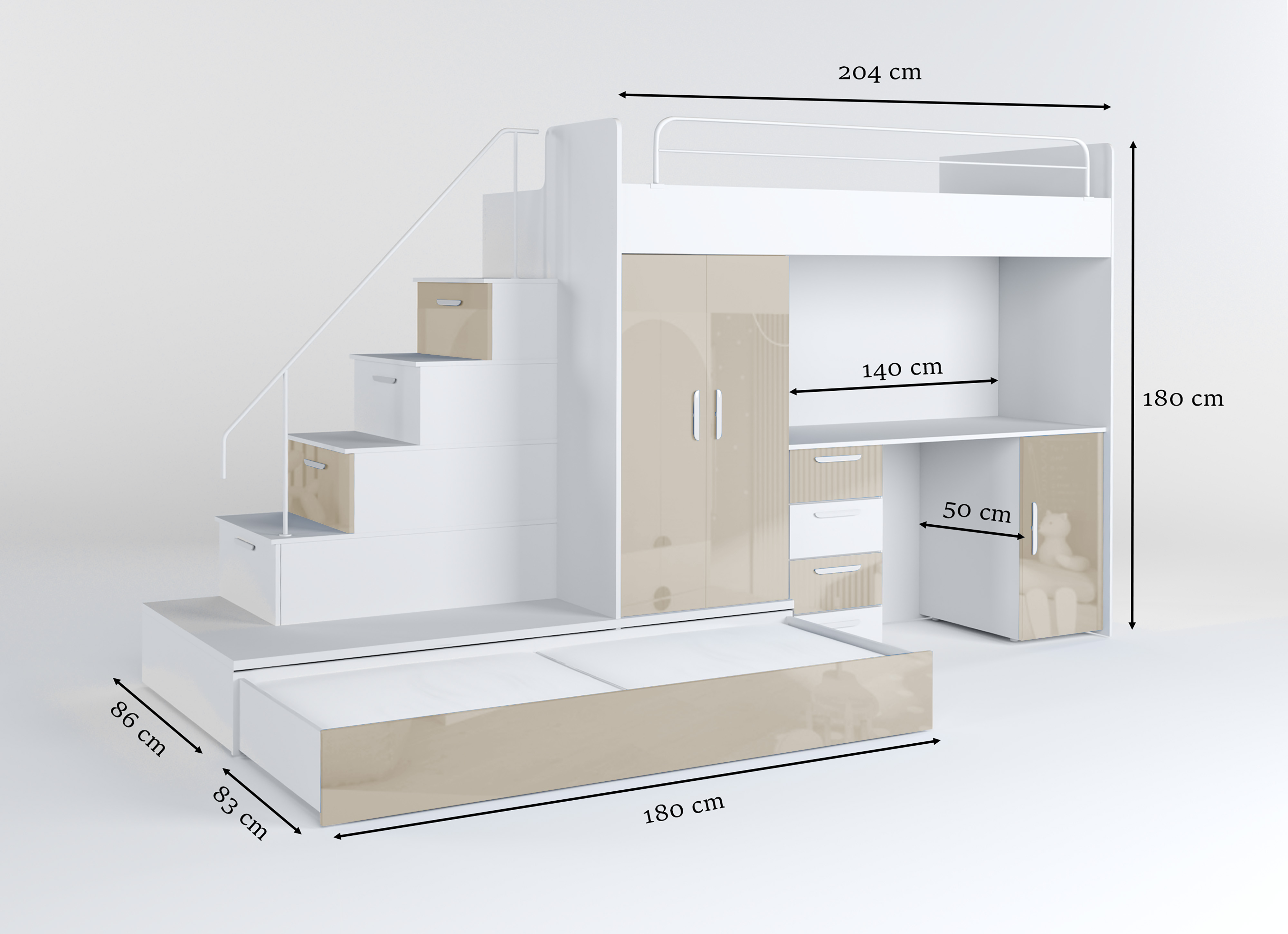 Zestaw posiada wysuwaną szufladę z materacem piankowym 75 × 175 cm – możliwe wyjęcie materaca i wykorzystanie szuflady jako pojemnika.
