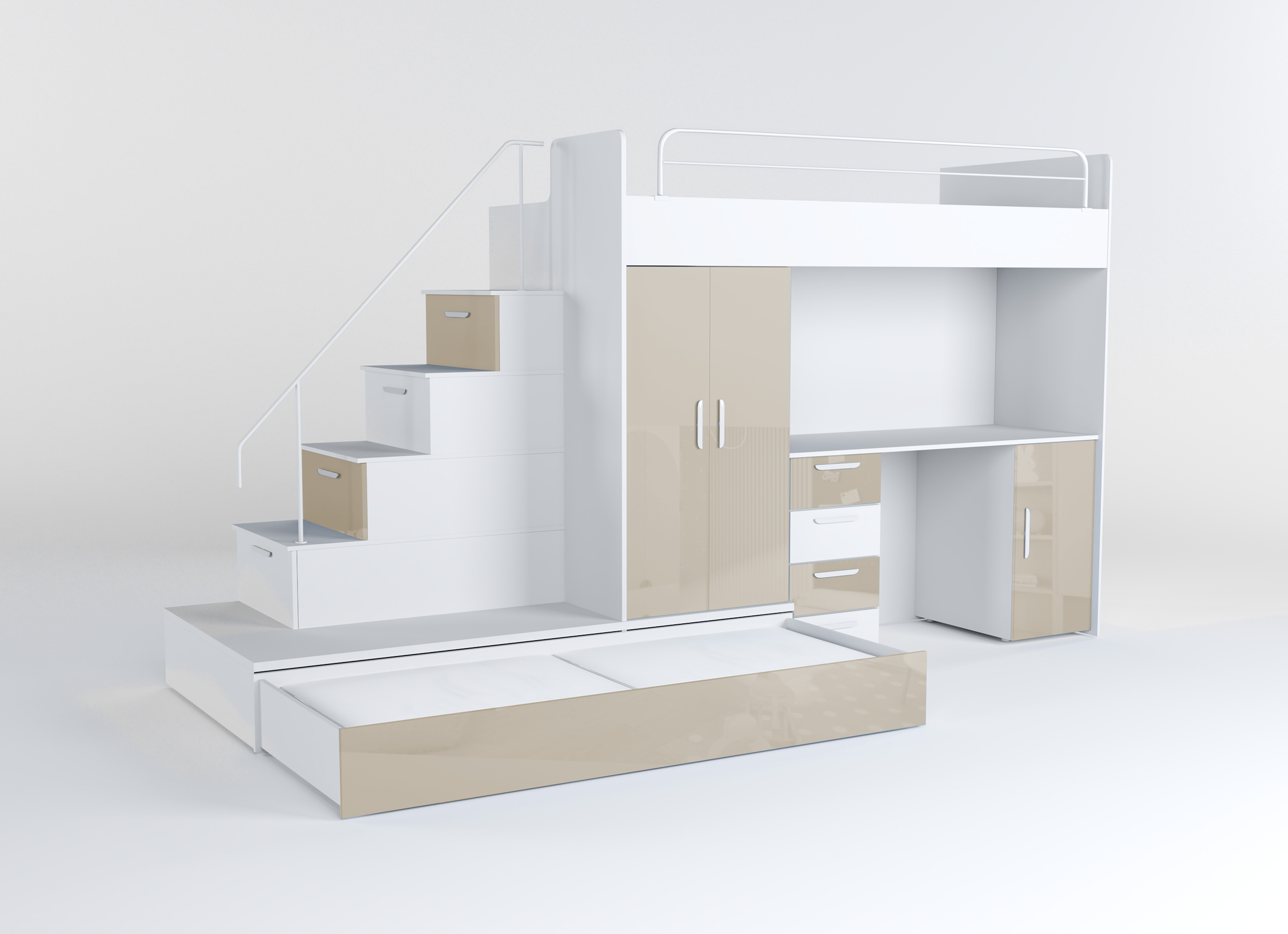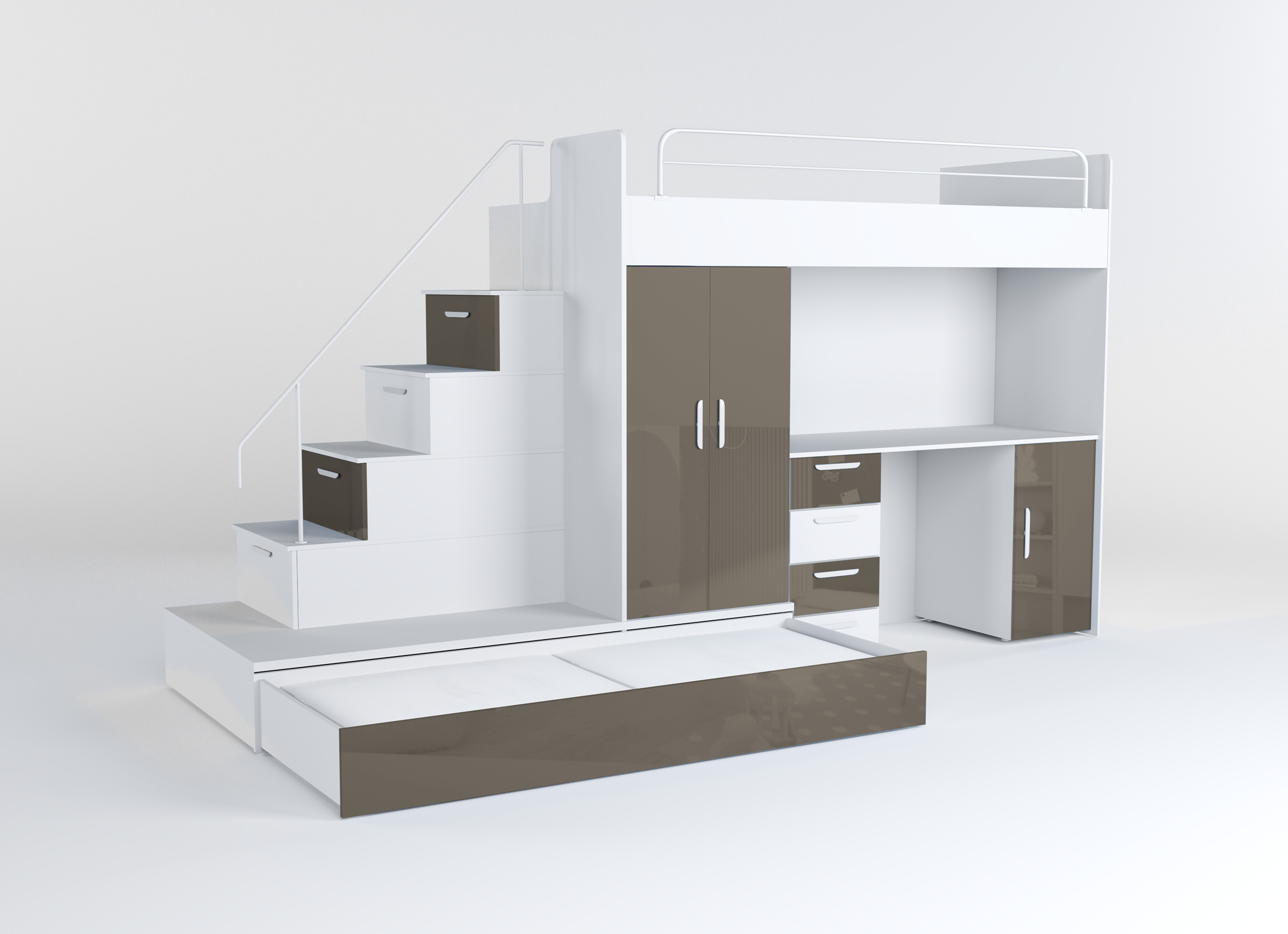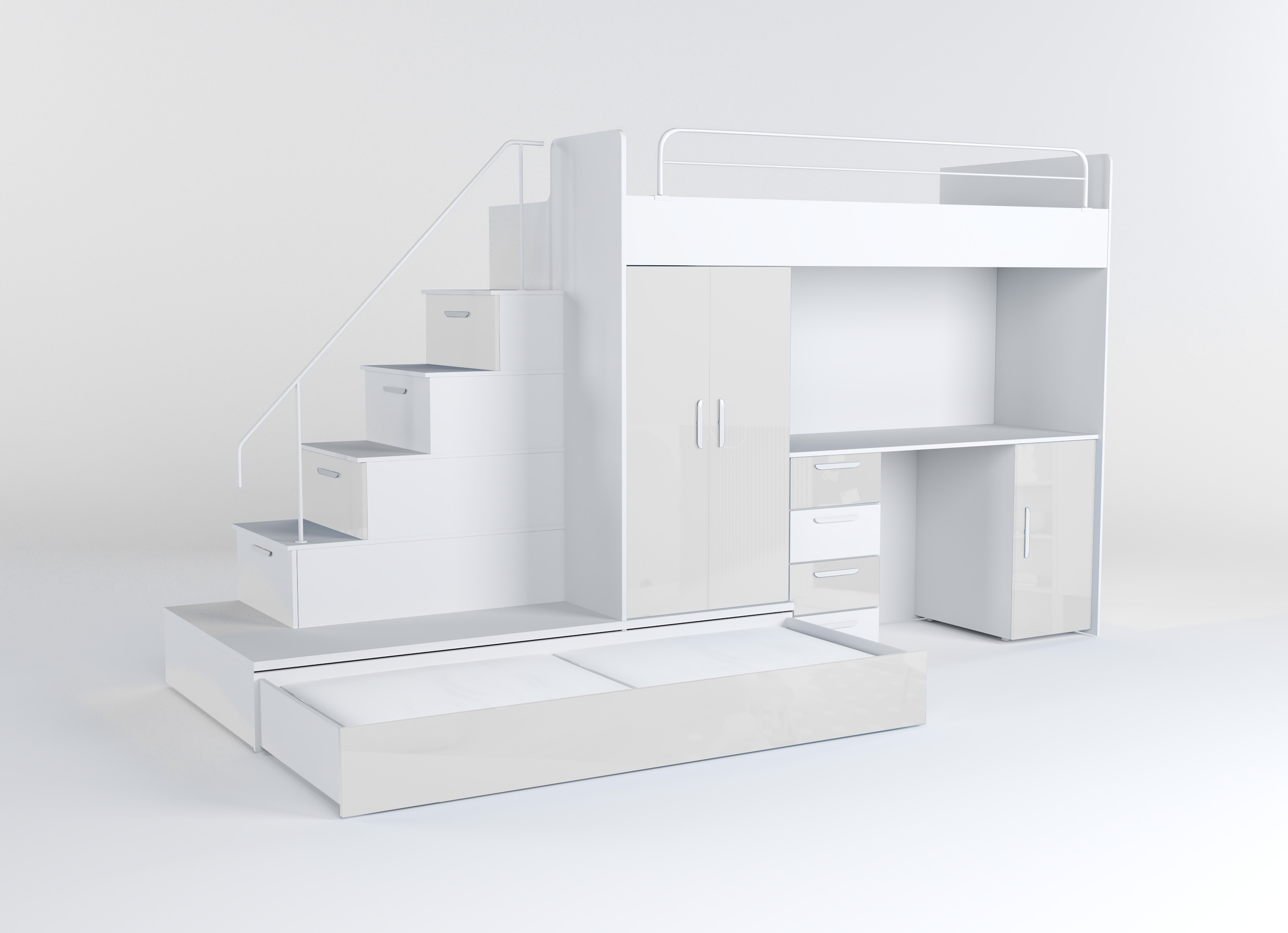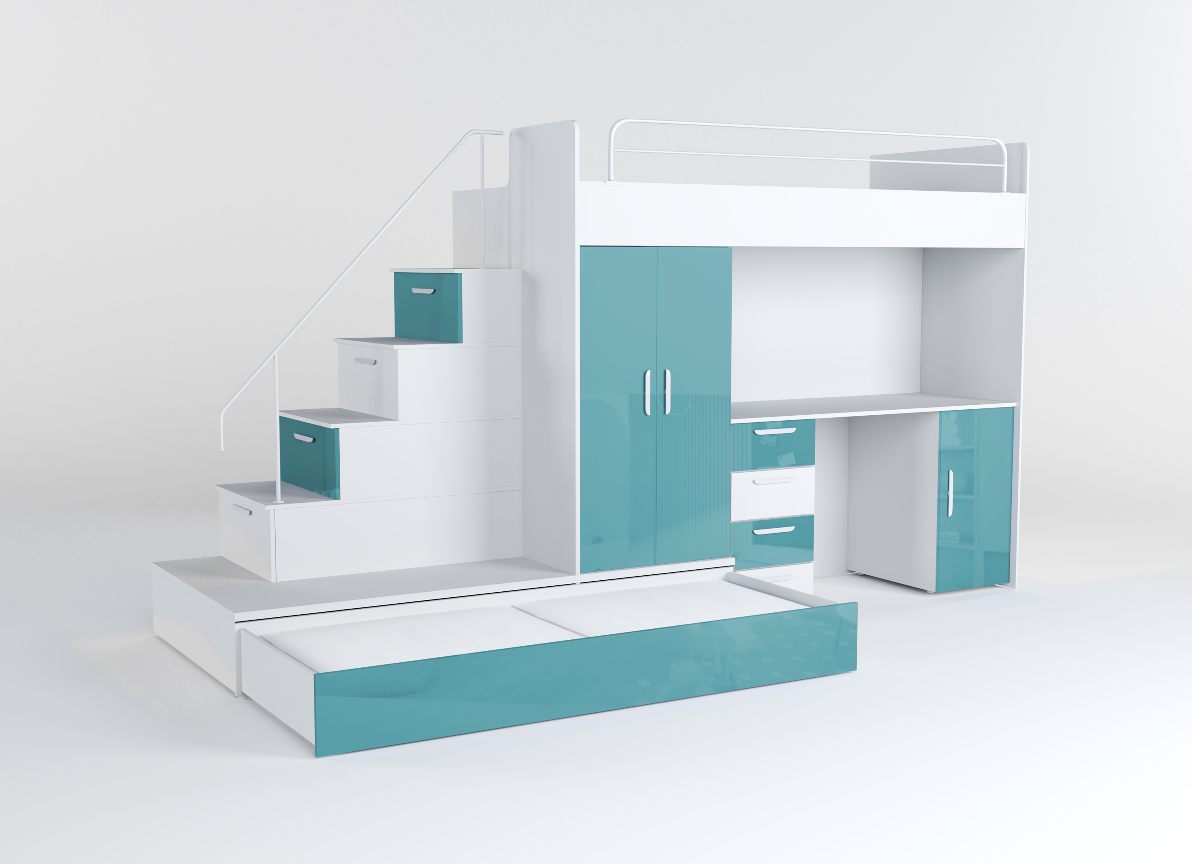 Zestaw posiada wysuwaną szufladę z materacem piankowym 75 × 175 cm – możliwe wyjęcie materaca i wykorzystanie szuflady jako pojemnika.