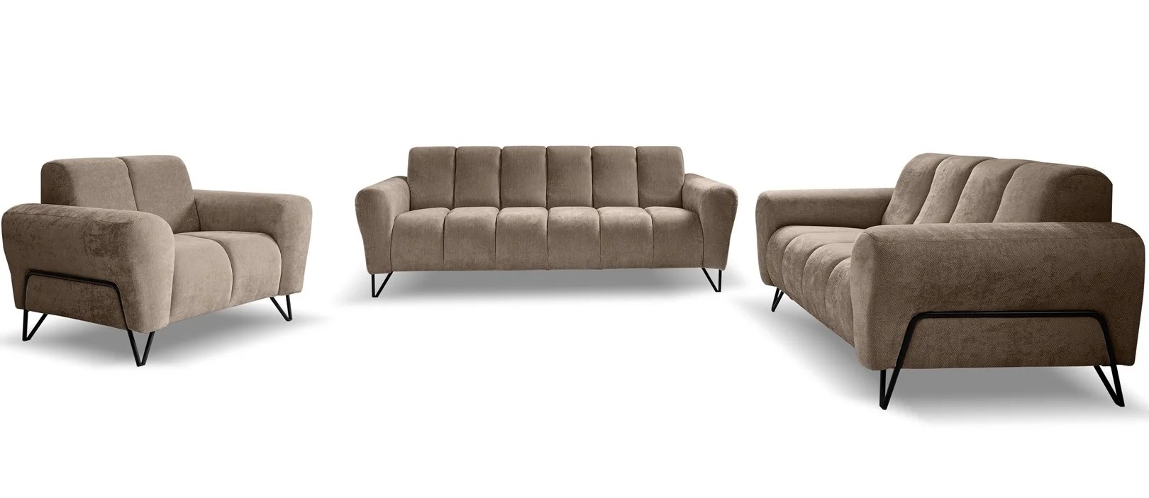 Eleganckie, pionowe przeszycia nadają całości nowoczesnego charakteru i podkreślają wyjątkowy styl kolekcji. Dzięki tapicerowanemu tyłowi, meble prezentują się doskonale z każdej strony, co pozwala na ustawienie ich nawet na środku salonu.